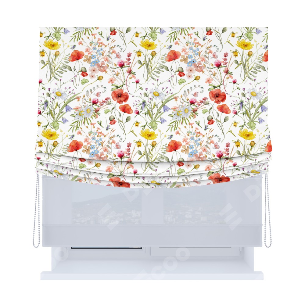 Римская штора день-ночь производителя «Cortin», используется для проёма, пошита из двух полотен, с лицевой блэкаут с нанесением сублимационной печати «Полевые маки», вторая ткань тюль (по стандарту комплектуется тюль белого цвета артикул V-01). Имеет универсальный механизм и подходит для монтажа: на потолок, на стену и в нишу. Удобное управление каждой шторой отдельно.