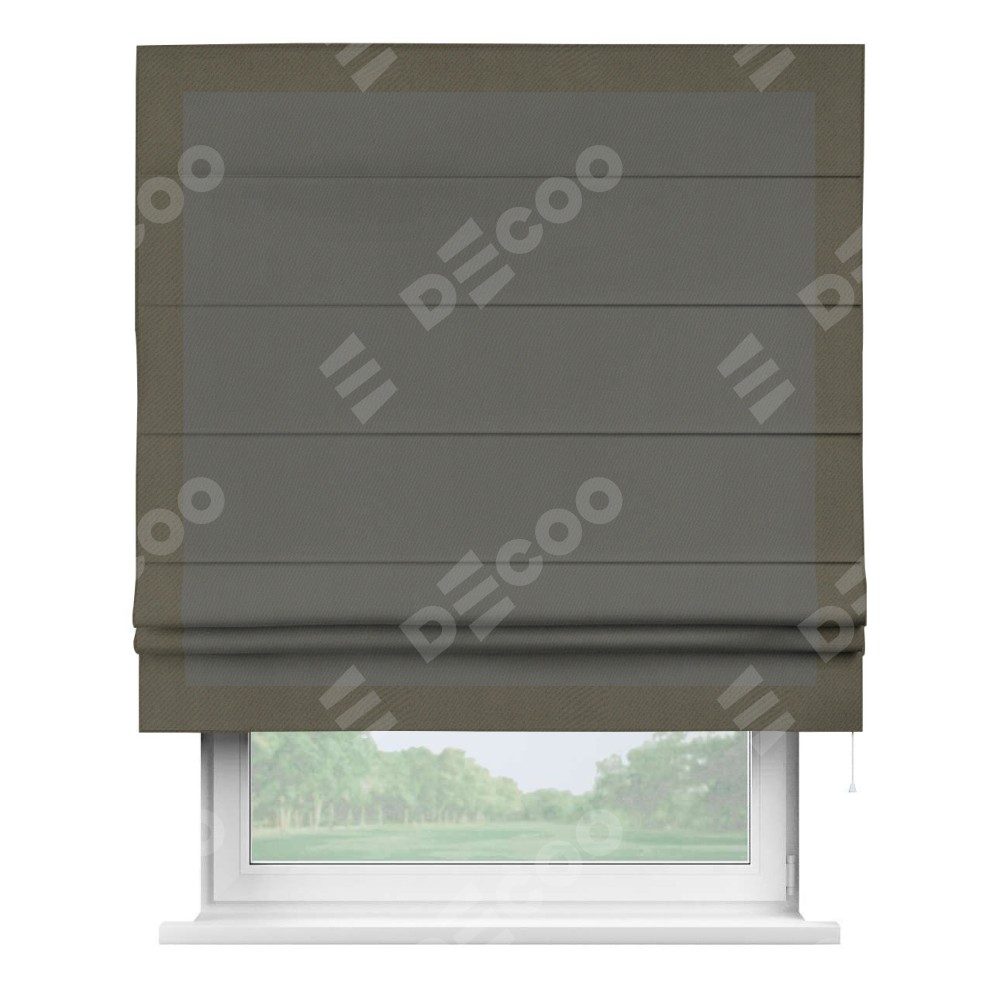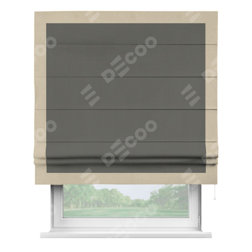 Римская штора производителя «Cortin», используется для проёма, пошита из ткани блэкаут однотонный тёмно-серый, артикул ткани 91570. Отделка шторы кантом «Чесс», ткань для канта используется из блэкаута однотонного разной расцветки на выбор. Имеет универсальный механизм и подходит для монтажа: на потолок, на стену и в нишу.