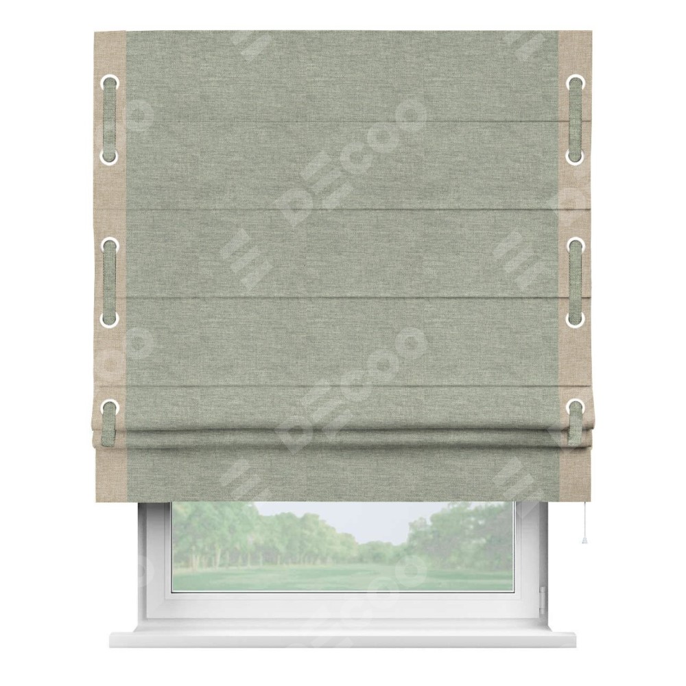 Римская штора производителя «Cortin», используется для проёма, пошита из ткани лён кашемир серый new, артикул 21618. Отделка шторы кантом «Стрим Дуо» на кантах расположены люверсы с пояском, ткань для канта используется из льна разной расцветки на выбор. Ткань для пояска обычно используется из основной ткани шторы, а так же можно сделать из любой расцветки по желанию. Имеет универсальный механизм и подходит для монтажа: на потолок, на стену и в нишу.