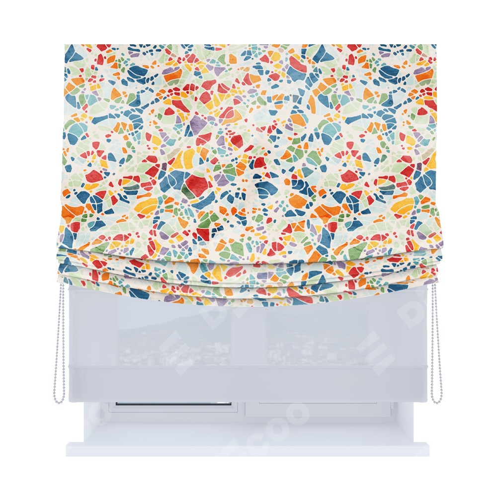 Римская штора день-ночь производителя «Cortin», используется для проёма, пошита из двух полотен, с лицевой блэкаут с нанесением сублимационной печати «Калейдоскоп», вторая ткань тюль (по стандарту комплектуется тюль белого цвета артикул V-01). Имеет универсальный механизм и подходит для монтажа: на потолок, на стену и в нишу. Удобное управление каждой шторой отдельно.