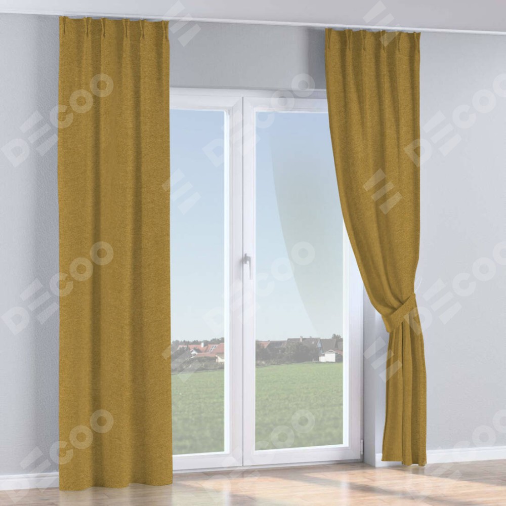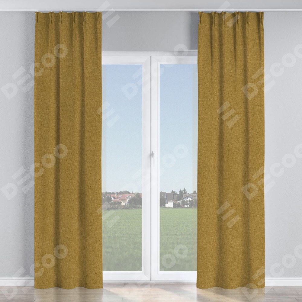 Комплект прямых штор, от производителя «Cortin», пошиты из ткани твид блэкаут горчица, артикул ткани 91237. С изнаночной стороны в верхней части штор пристрачивается шторная лента с декоративными складками «Кустик». Для создания элегантных складок прямые шторы шьются по стандарту с коэффициентом 1:2 (на 100 см. ширины проёма 200 см. ширины ткани).