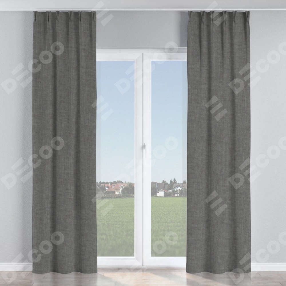 Комплект прямых штор, от производителя «Cortin», пошиты из ткани лён тёмно-серый, артикул ткани 7441. С изнаночной стороны в верхней части штор пристрачивается шторная лента с декоративными складками «Кустик». Для создания элегантных складок прямые шторы шьются по стандарту с коэффициентом 1:2 (на 100 см. ширины проёма 200 см. ширины ткани).