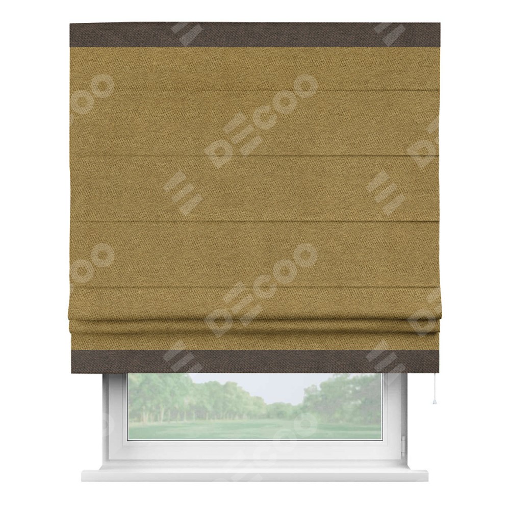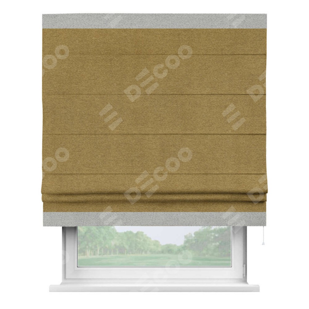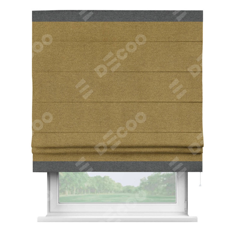 Римская штора производителя «Cortin», используется для проёма, пошита из ткани твид блэкаут горчица, артикул 91237. Отделка шторы кантом «Горизонт», ткань для канта используется из твида разной расцветки на выбор. Имеет универсальный механизм и подходит для монтажа: на потолок, на стену и в нишу.