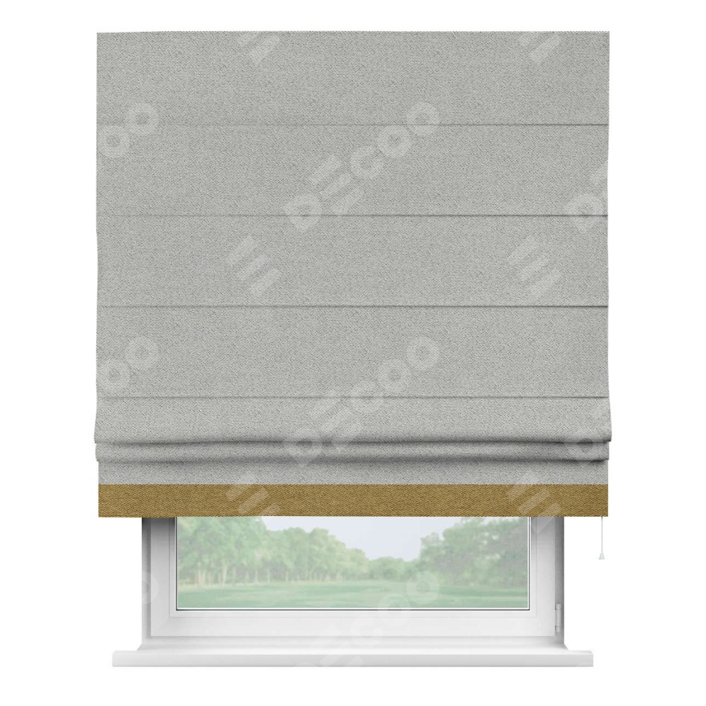 Римская штора производителя «Cortin», используется для проёма, пошита из ткани твид блэкаут светло-серый, артикул 90936. Отделка шторы кантом «Джестер», ткань для канта используется из твида разной расцветки на выбор. Имеет универсальный механизм и подходит для монтажа: на потолок, на стену и в нишу.