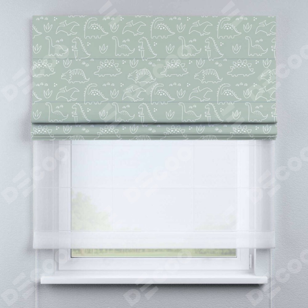 Двойная римская штора «День-ночь» от производителя Cortin предназначена для использования в проёмах. Эта штора уникальна тем, что состоит из двух полотен. На лицевой стороне находится блэкаут с нанесением сублимационной печати «Динопарк», обеспечивающий эффективное затемнение. В комплект также входит вторая ткань — легкий белый тюль (артикул: V-01), который добавляет изящества и легкости оформлению окна. Кроме того, доступны и другие разновидности ткани тюль, выбор которых доступен по  ссылке .