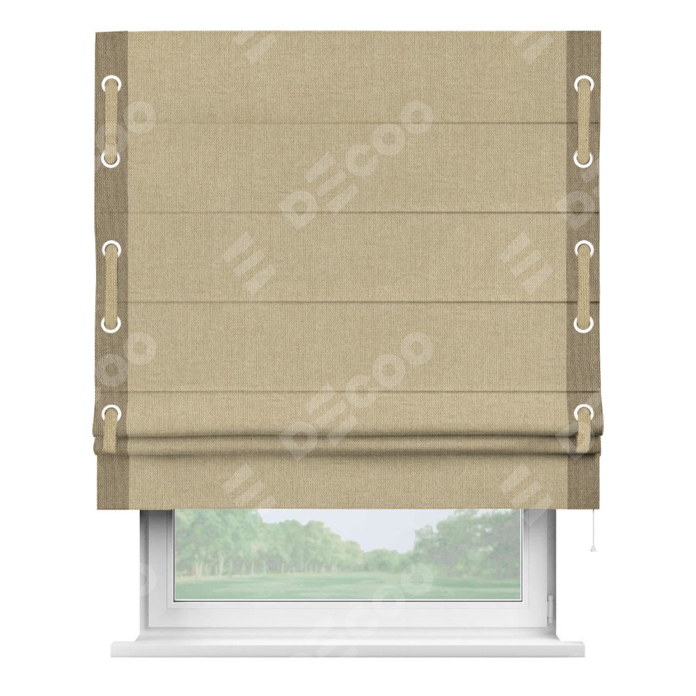 Римская штора пошита из ткани лён димаут песочный, артикул: 16256, с отделкой кантом «Стрим Дуо», дополненная декоративными люверсами на этих кантах и протянутым пояском из основного цвета римской шторы, представляет собой высоко декоративное и функциональное решение для оконного оформления. Канты, расположенные по обеим боковым сторонам шторы, уже добавляют изысканности и завершенности внешнему виду. Добавление люверсов и пояска не только усиливает декоративный эффект, но и придает шторе дополнительную текстурность и глубину.