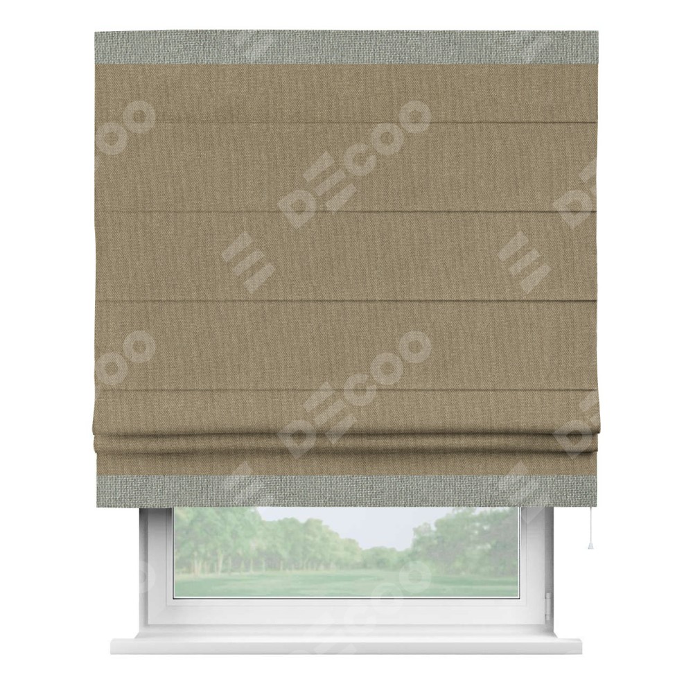 Римская штора пошита из ткани лён димаут тёмно-бежевый, артикул: 16261, с отделкой кантом «Горизонт» предлагает уникальное дизайнерское решение, при котором кант располагается только вверху и снизу шторы. Такое решение делает акцент на горизонтальных линиях, визуально расширяя пространство и придавая окну более строгий и организованный вид. Отделка кантом в этих ключевых местах не только украшает штору, но и способствует её долговечности, защищая наиболее уязвимые к износу края.
