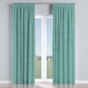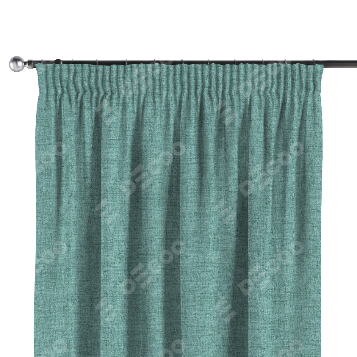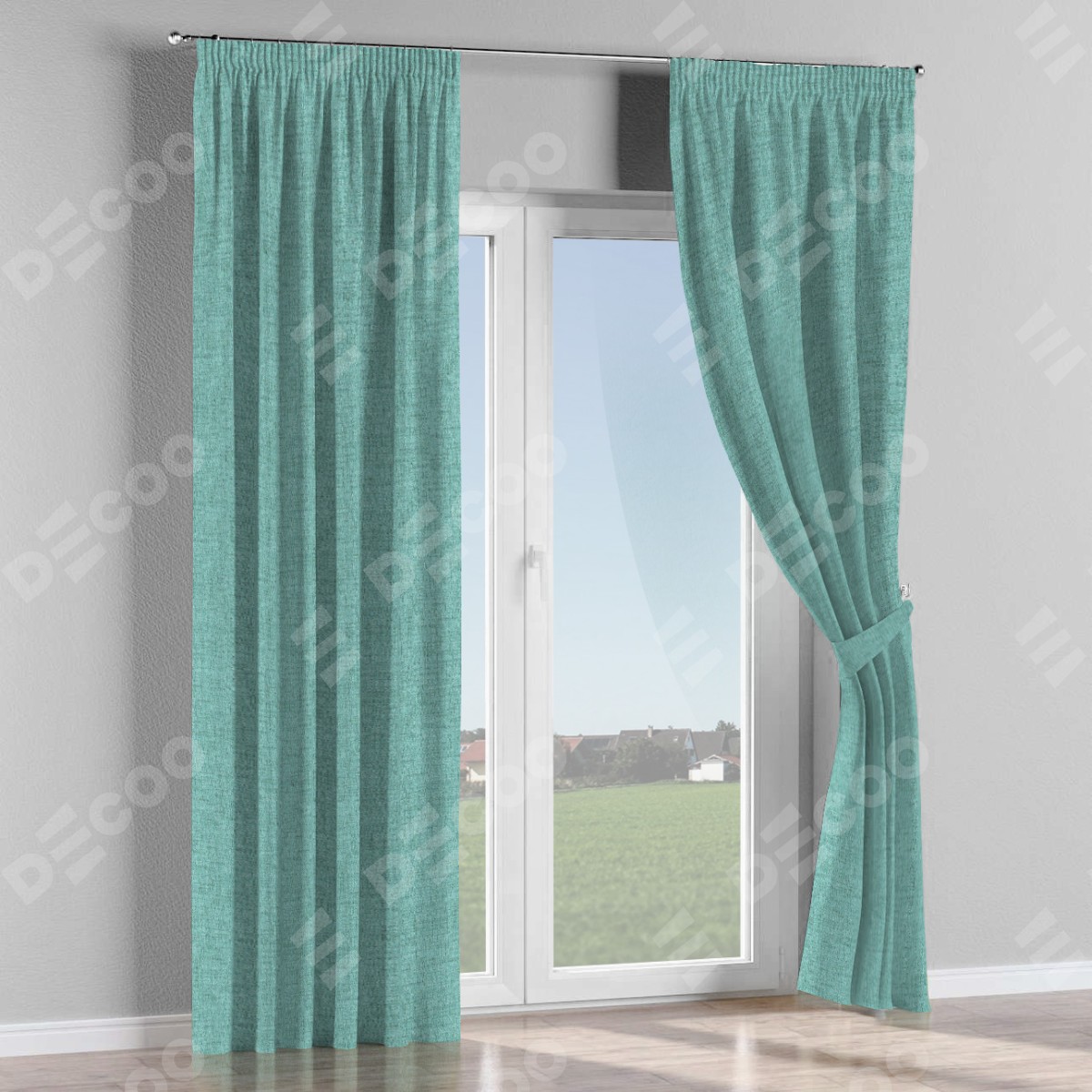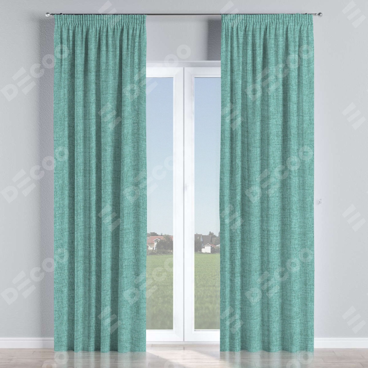 Комплект прямых штор, от производителя «Cortin», пошиты из ткани рогожка димаут аквамариновый крайола, артикул ткани 91023. С изнаночной стороны в верхней части штор пристрачивается шторная лента с декоративными складками «Карандаш». Для создания элегантных складок прямые шторы шьются по стандарту с коэффициентом 1:2 (на 100 см. ширины проёма 200 см. ширины ткани).