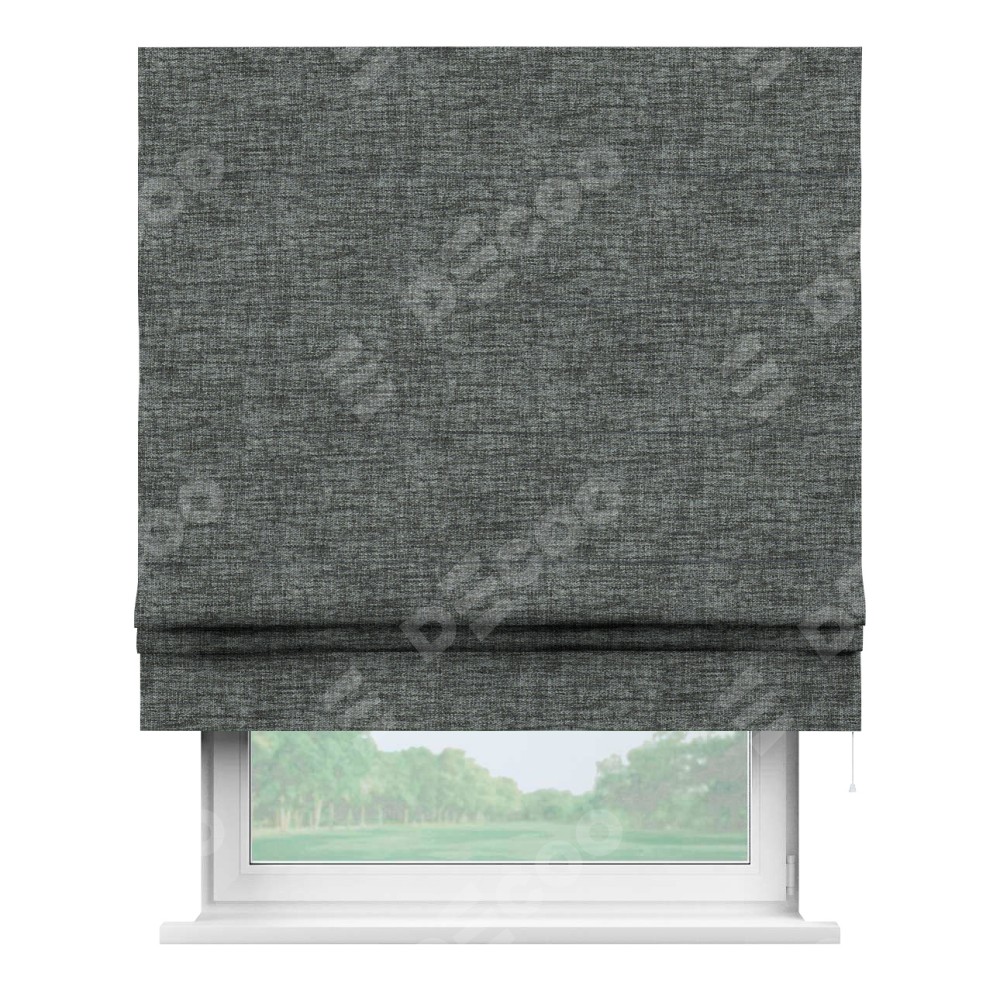 Классическая римская штора производителя «Cortin», пошита из ткани рогожка димаут тёмно-серый, артикул: 91029. Имеет универсальный механизм и подходит для монтажа: на потолок, на стену и в нишу.