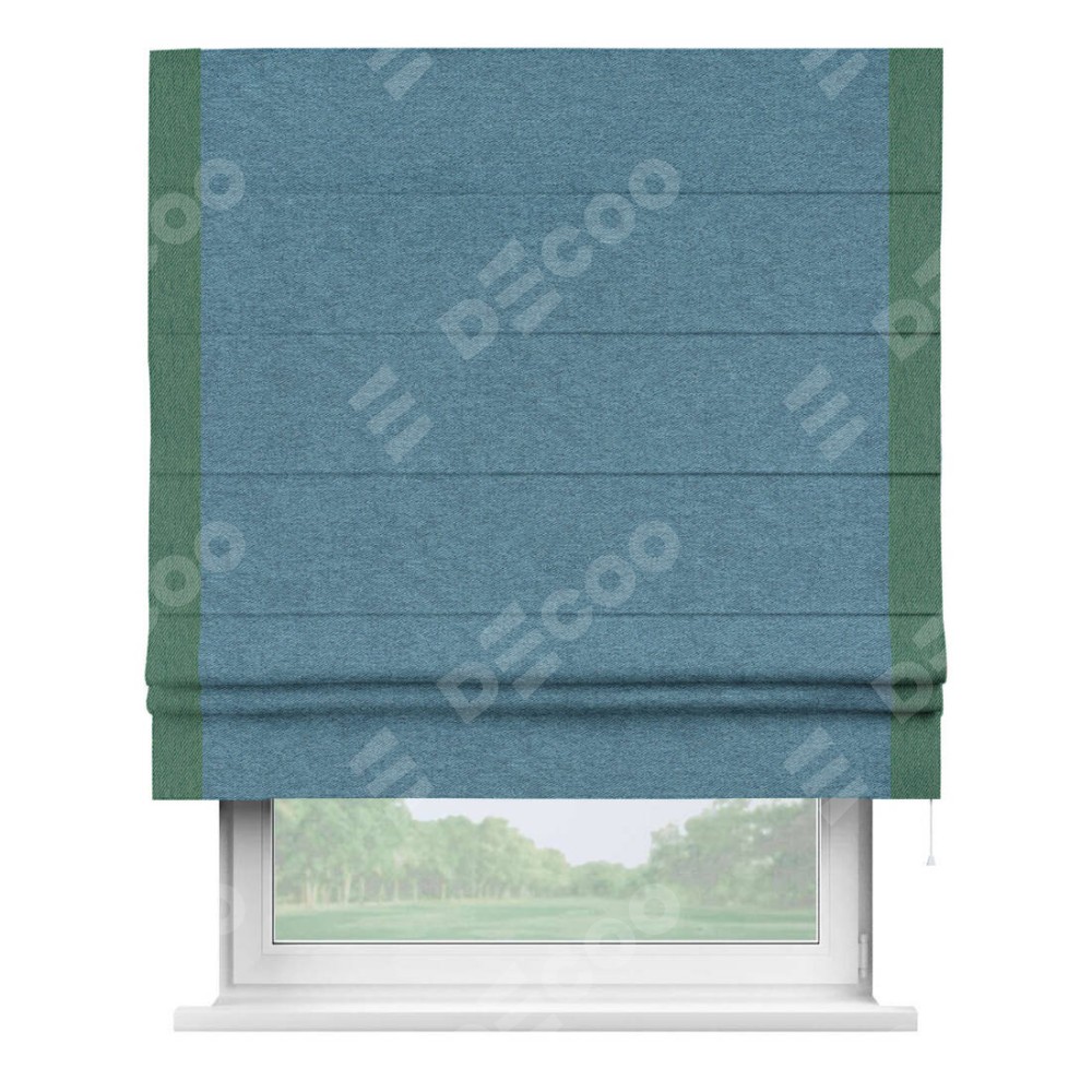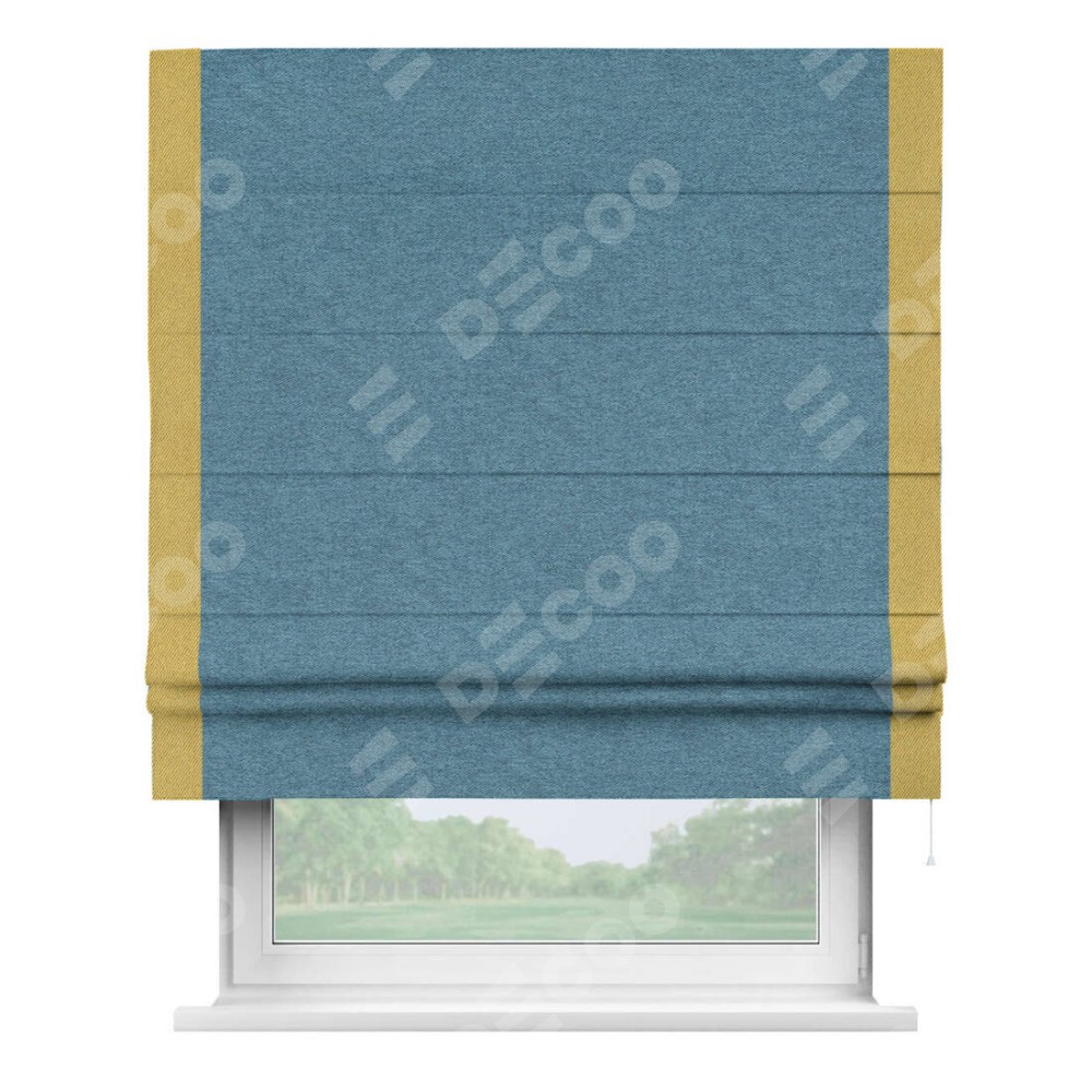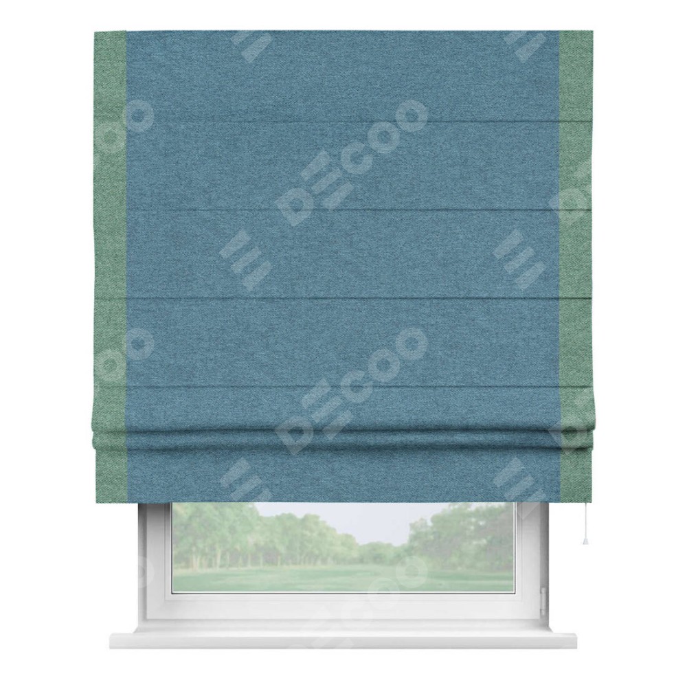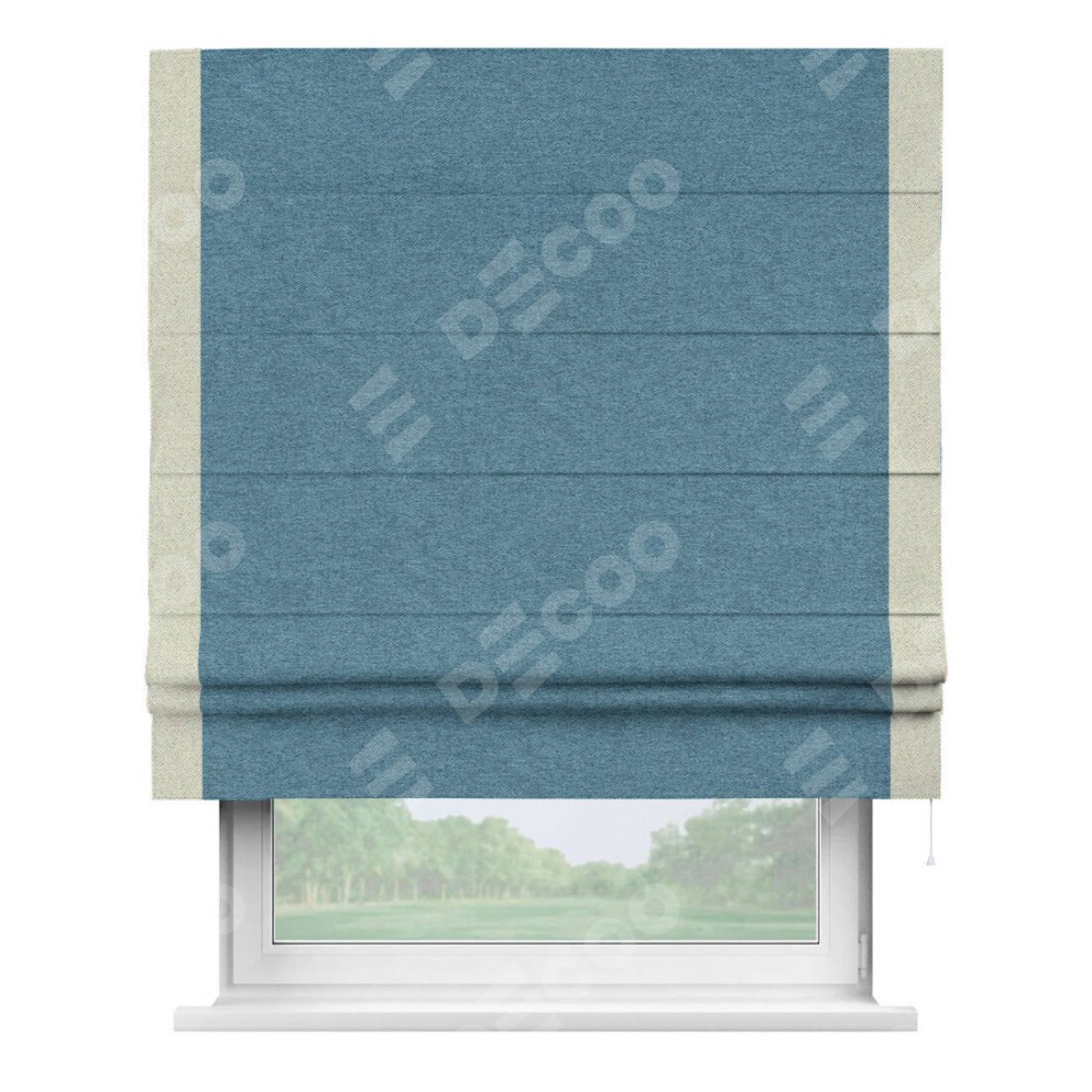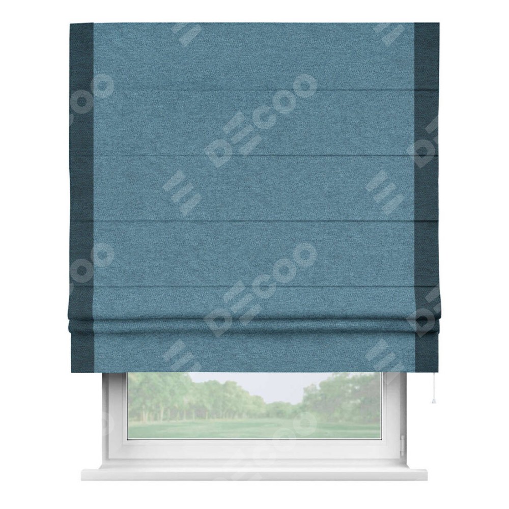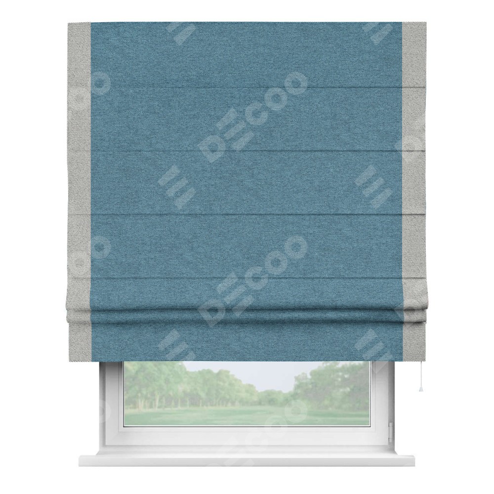 Римская штора пошита из ткани твид блэкаут светло-синий, артикул: 90935, с отделкой кантом «Стрим Дуо» выделяется наличием кантов по обоим бокам шторы, слева и справа. Этот дизайн придает шторе аккуратный и завершенный вид, акцентируя вертикальные линии и визуально вытягивая окно в высоту. Отделка кантом по бокам не только украшает штору, но и служит практической функцией, укрепляя края и продлевая срок службы изделия.