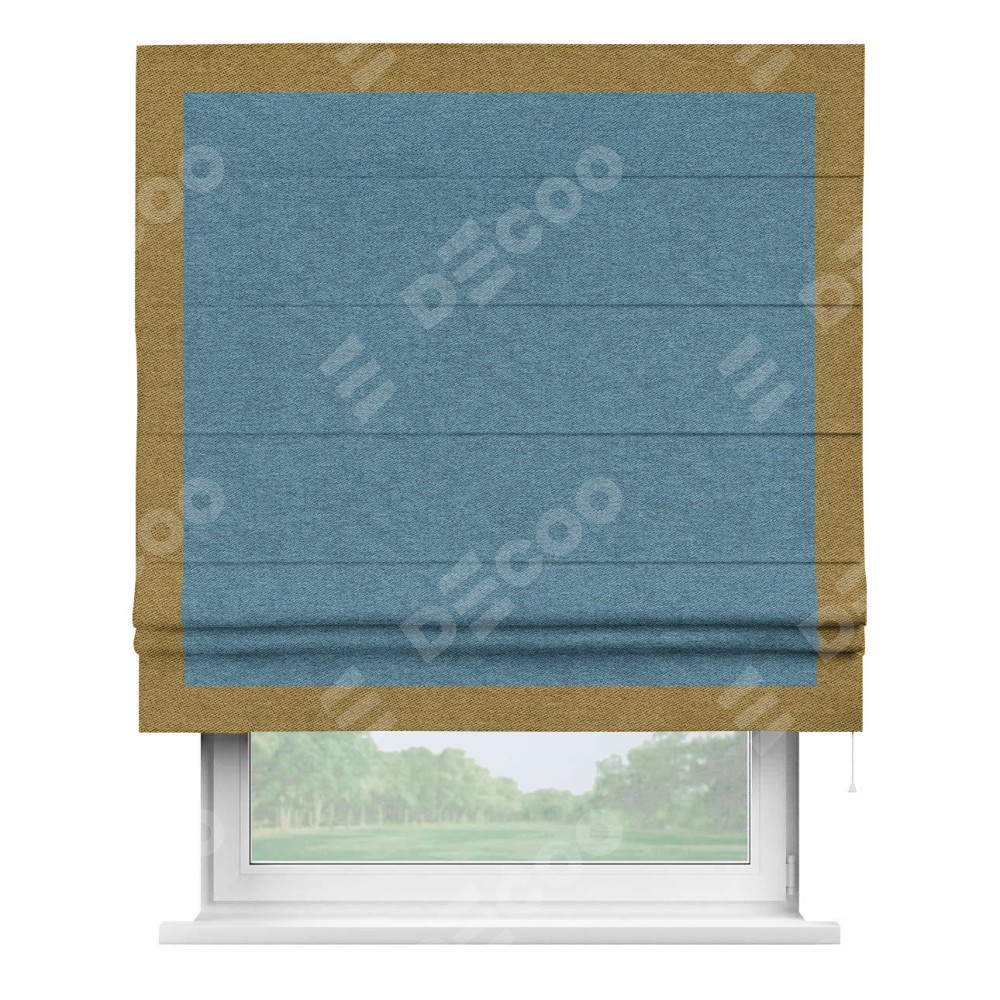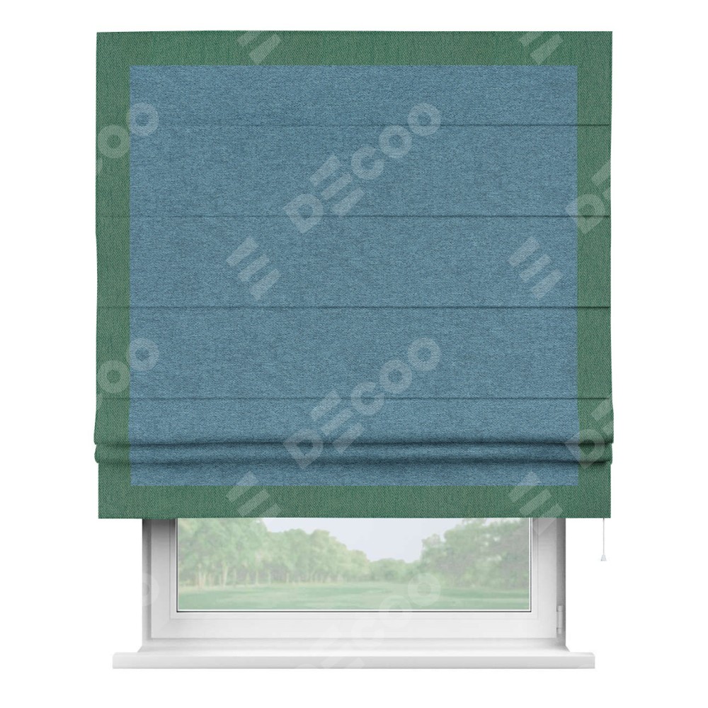 Римская штора пошита из ткани твид блэкаут светло-синий, артикул: 90935, с отделкой кантом «Чесс» отличается своей уникальной деталью — наличием канта не только по бокам и снизу, но и сверху по всем краям шторы. Это придает шторе особенно аккуратный и завершенный вид, делая акцент на границах и форме шторы. Отделка кантом по всему периметру шторы усиливает её декоративные качества и подчеркивает строгую геометрию, что может быть особенно актуально для современных и минималистичных интерьеров.