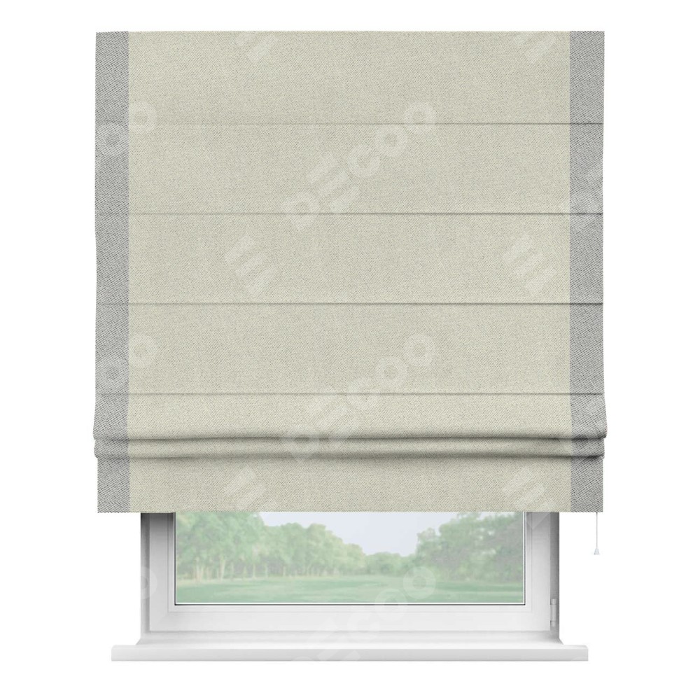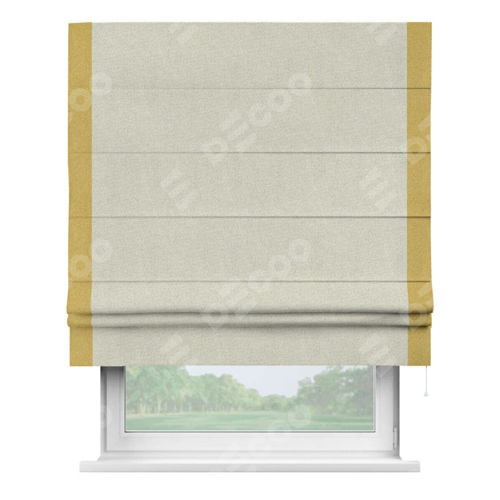 Римская штора пошита из ткани твид блэкаут шампань, артикул: 90929, с отделкой кантом «Стрим Дуо» выделяется наличием кантов по обоим бокам шторы, слева и справа. Этот дизайн придает шторе аккуратный и завершенный вид, акцентируя вертикальные линии и визуально вытягивая окно в высоту. Отделка кантом по бокам не только украшает штору, но и служит практической функцией, укрепляя края и продлевая срок службы изделия.
