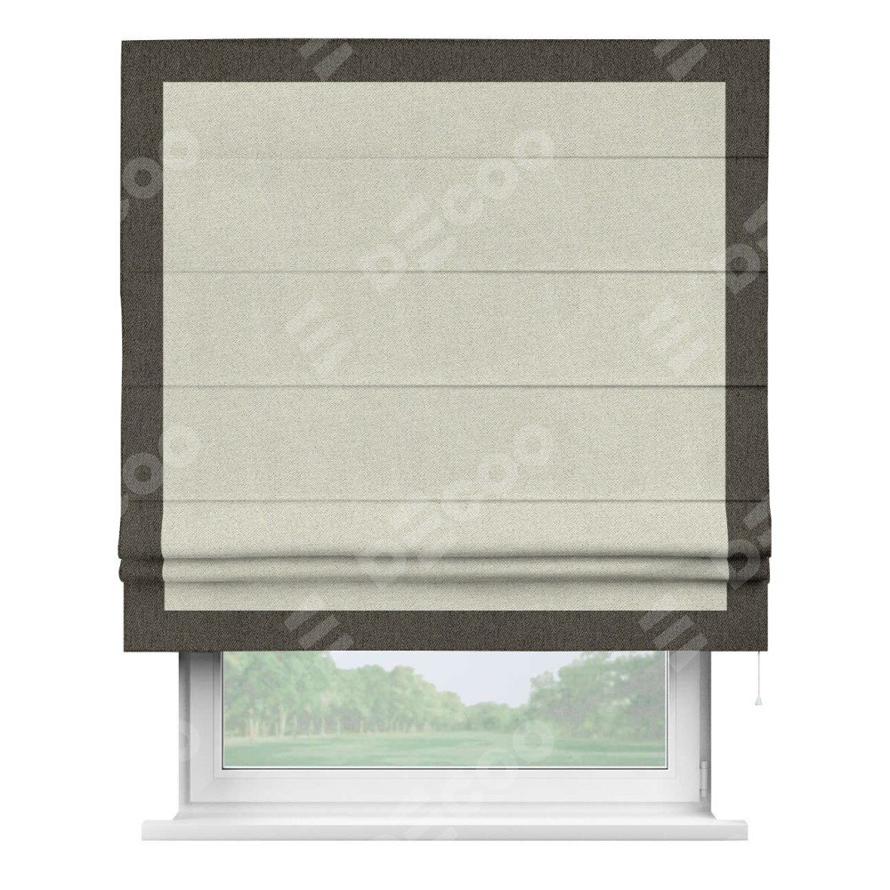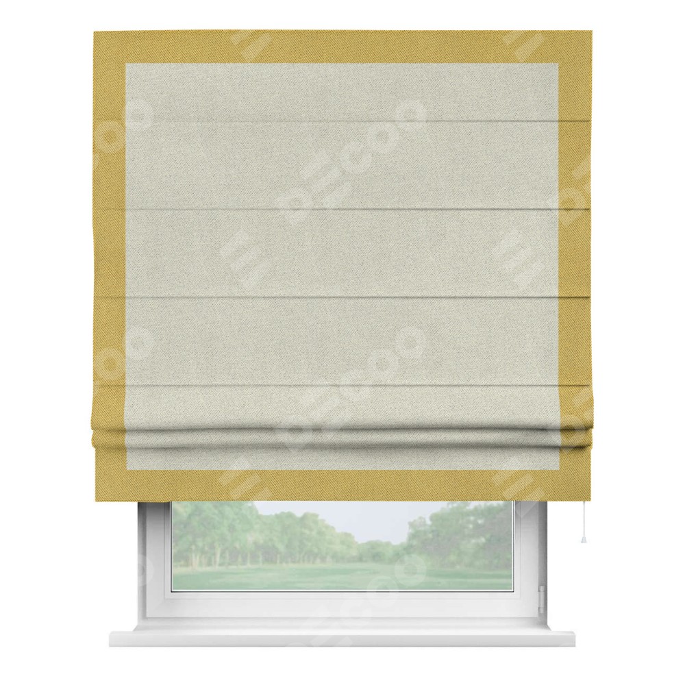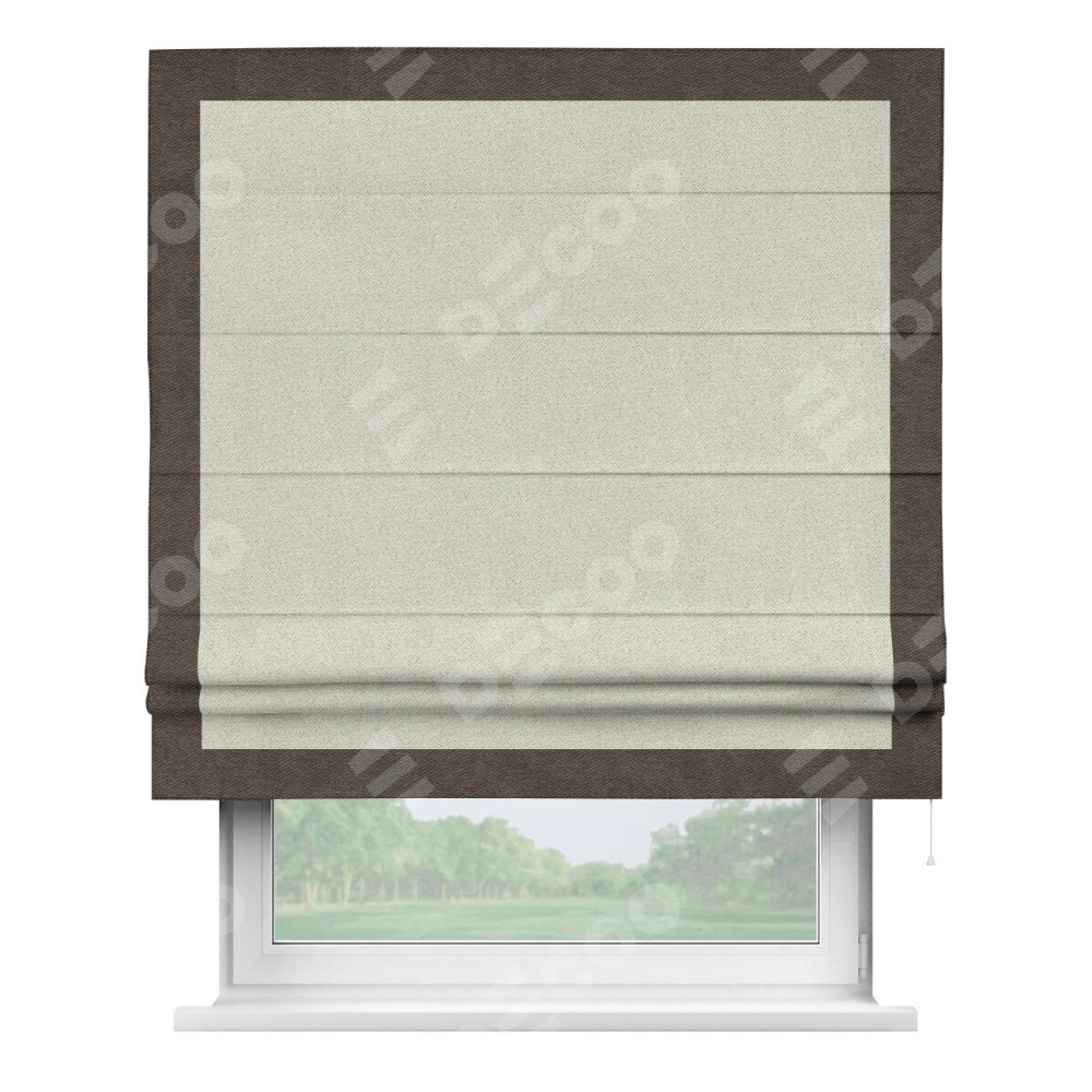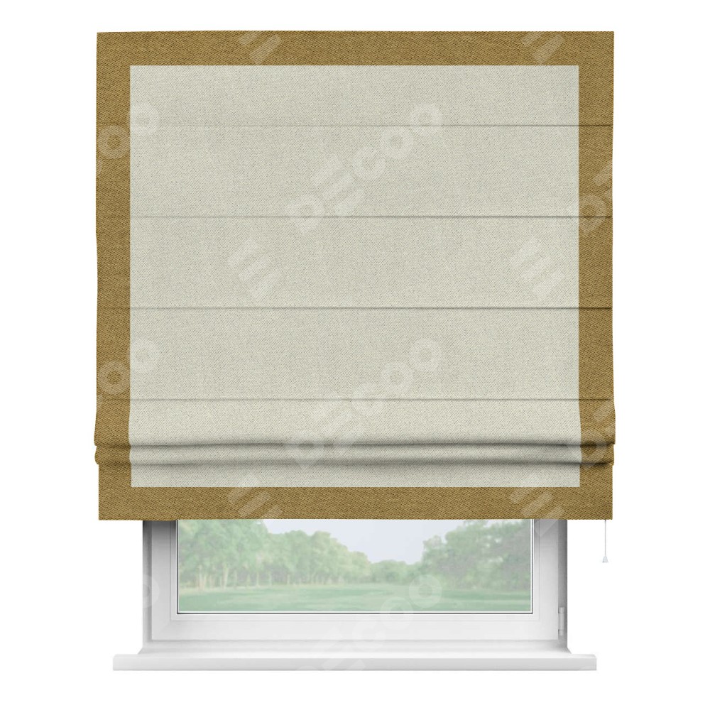 Римская штора пошита из ткани твид блэкаут шампань, артикул: 90929, с отделкой кантом «Чесс» отличается своей уникальной деталью — наличием канта не только по бокам и снизу, но и сверху по всем краям шторы. Это придает шторе особенно аккуратный и завершенный вид, делая акцент на границах и форме шторы. Отделка кантом по всему периметру шторы усиливает её декоративные качества и подчеркивает строгую геометрию, что может быть особенно актуально для современных и минималистичных интерьеров.