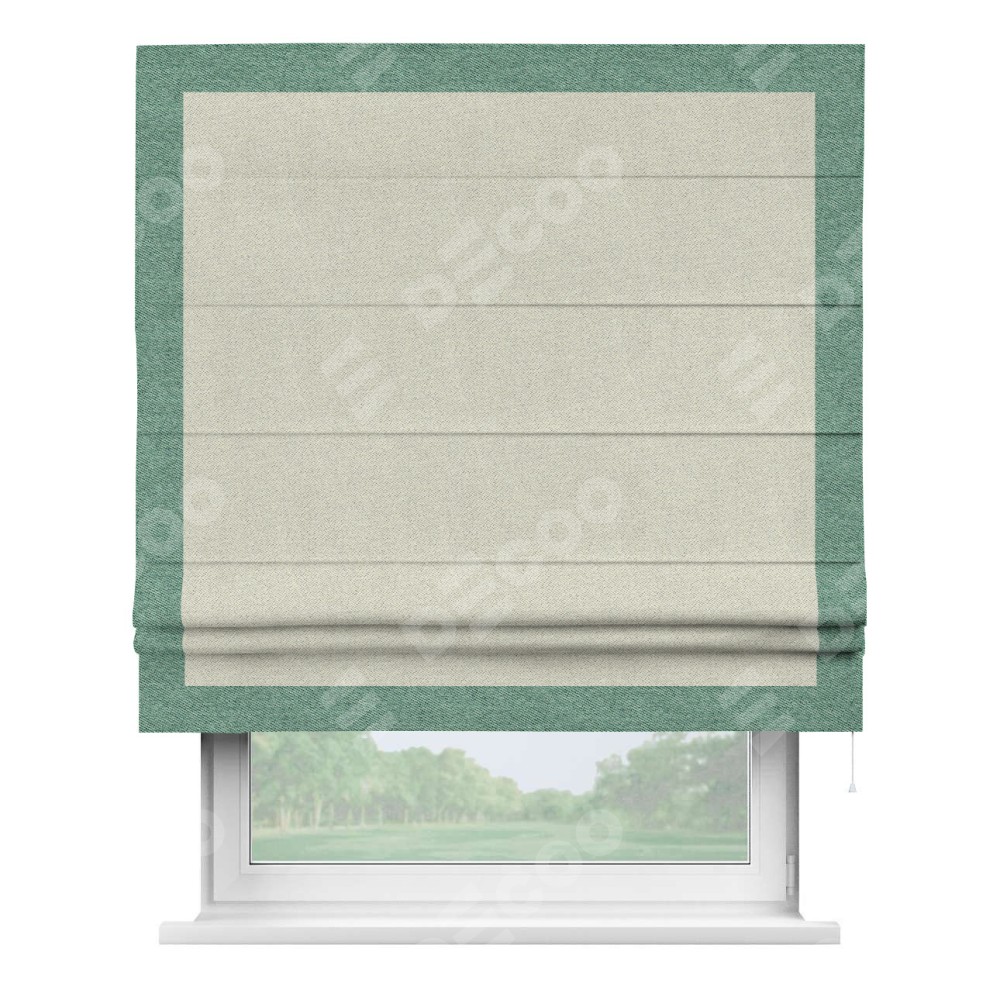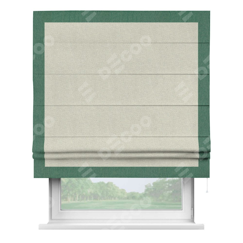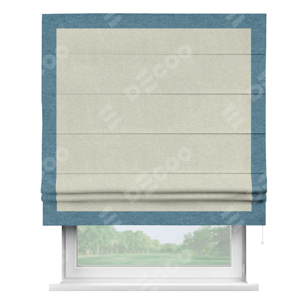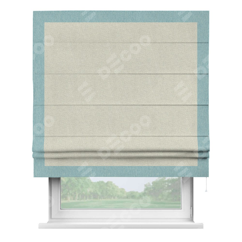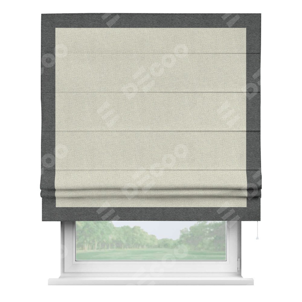Римская штора пошита из ткани твид блэкаут шампань, артикул: 90929, с отделкой кантом «Чесс» отличается своей уникальной деталью — наличием канта не только по бокам и снизу, но и сверху по всем краям шторы. Это придает шторе особенно аккуратный и завершенный вид, делая акцент на границах и форме шторы. Отделка кантом по всему периметру шторы усиливает её декоративные качества и подчеркивает строгую геометрию, что может быть особенно актуально для современных и минималистичных интерьеров.