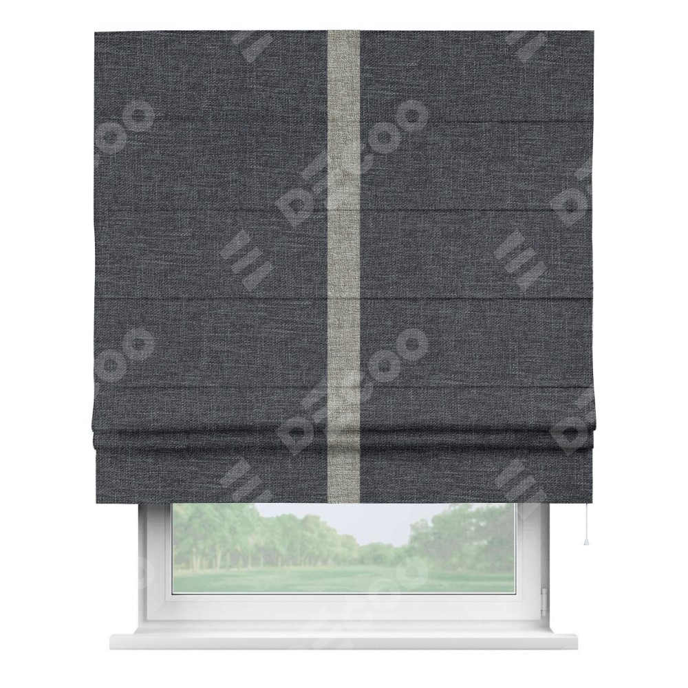 Римская штора пошита из ткани рогожка димаут графит, артикул: 90950, с отделкой кантом «Хайвэй» представляет собой уникальное и смелое дизайнерское решение, где кант расположен вертикально посередине шторы. Этот дизайн не только выделяет штору среди других вариантов оформления окон, но и создает интересный визуальный акцент, привлекая внимание к центру окна и разделяя штору на визуальные зоны. Такой нестандартный подход добавляет динамичности интерьеру и может быть использован для подчеркивания особенностей оформления помещения.