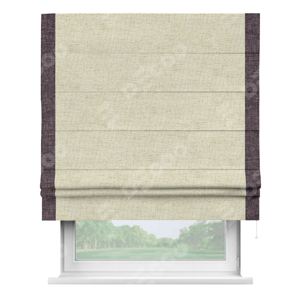 Римская штора пошита из ткани рогожка димаут золотой песок, артикул: 91015, с отделкой кантом «Стрим Дуо» выделяется наличием кантов по обоим бокам шторы, слева и справа. Этот дизайн придает шторе аккуратный и завершенный вид, акцентируя вертикальные линии и визуально вытягивая окно в высоту. Отделка кантом по бокам не только украшает штору, но и служит практической функцией, укрепляя края и продлевая срок службы изделия.