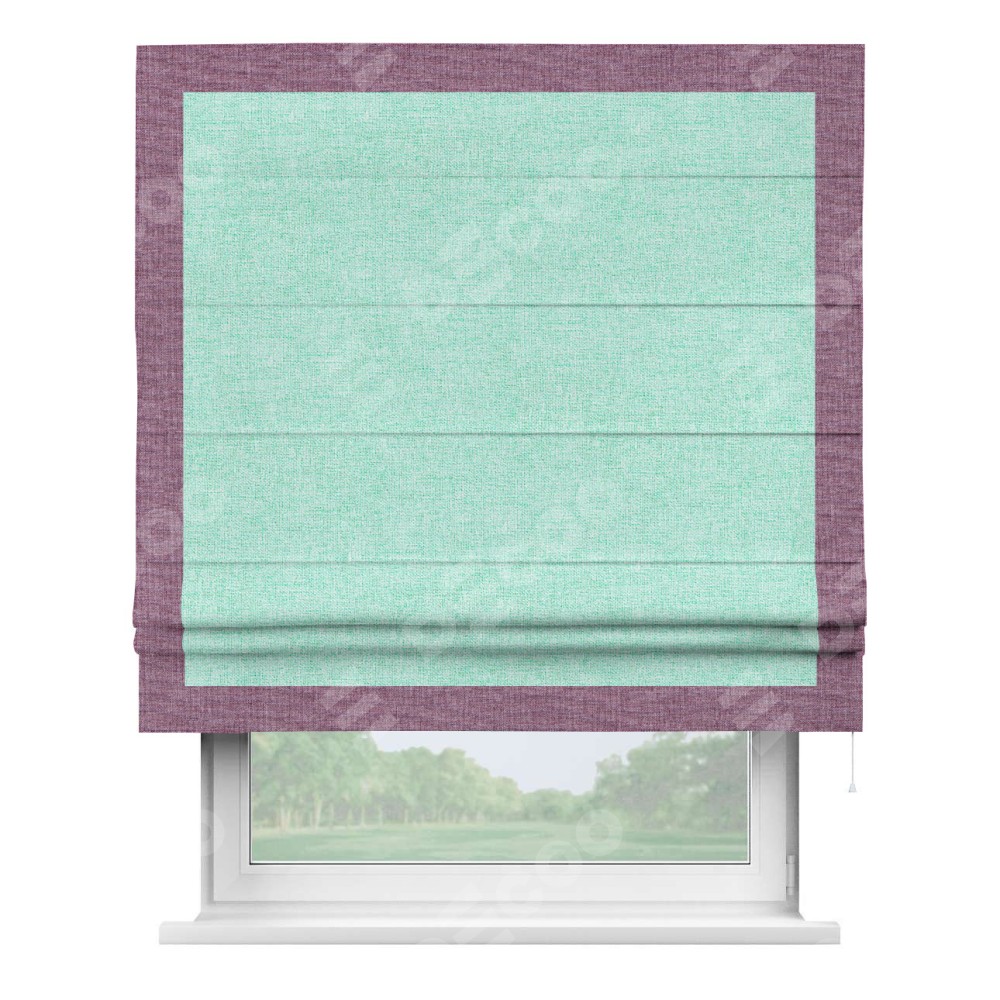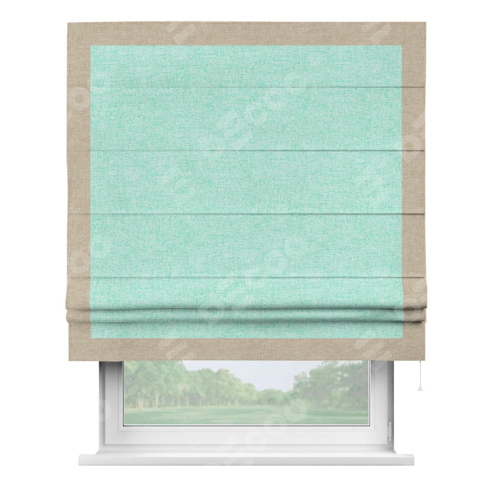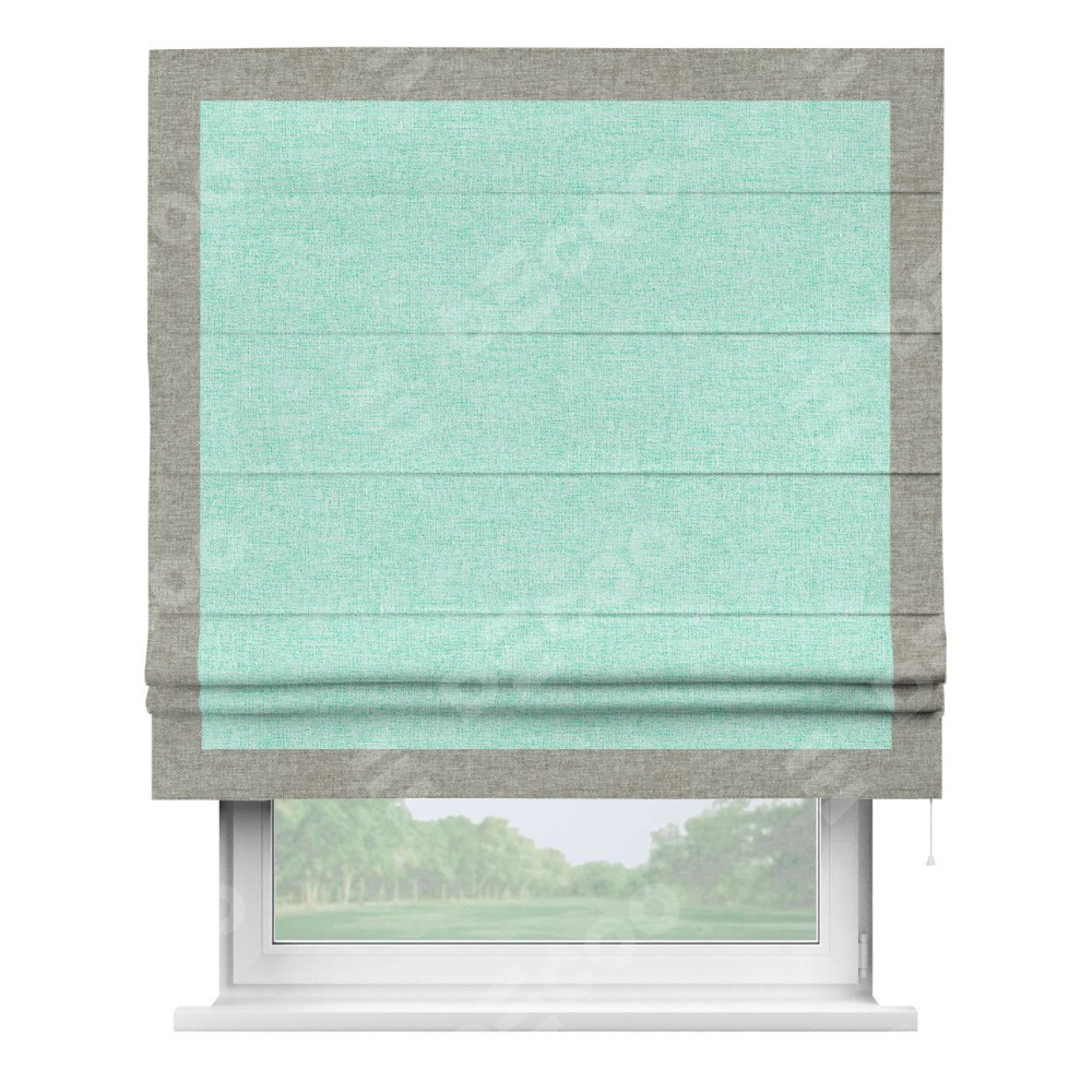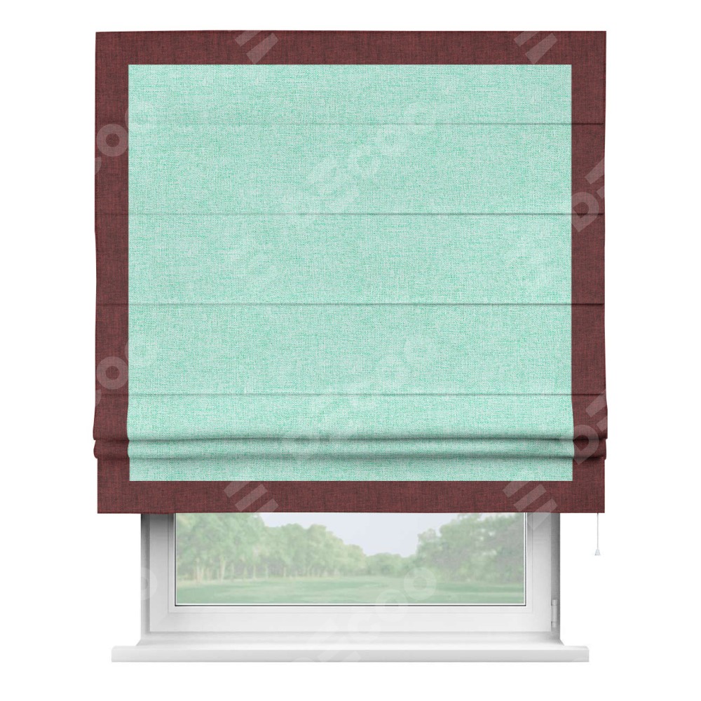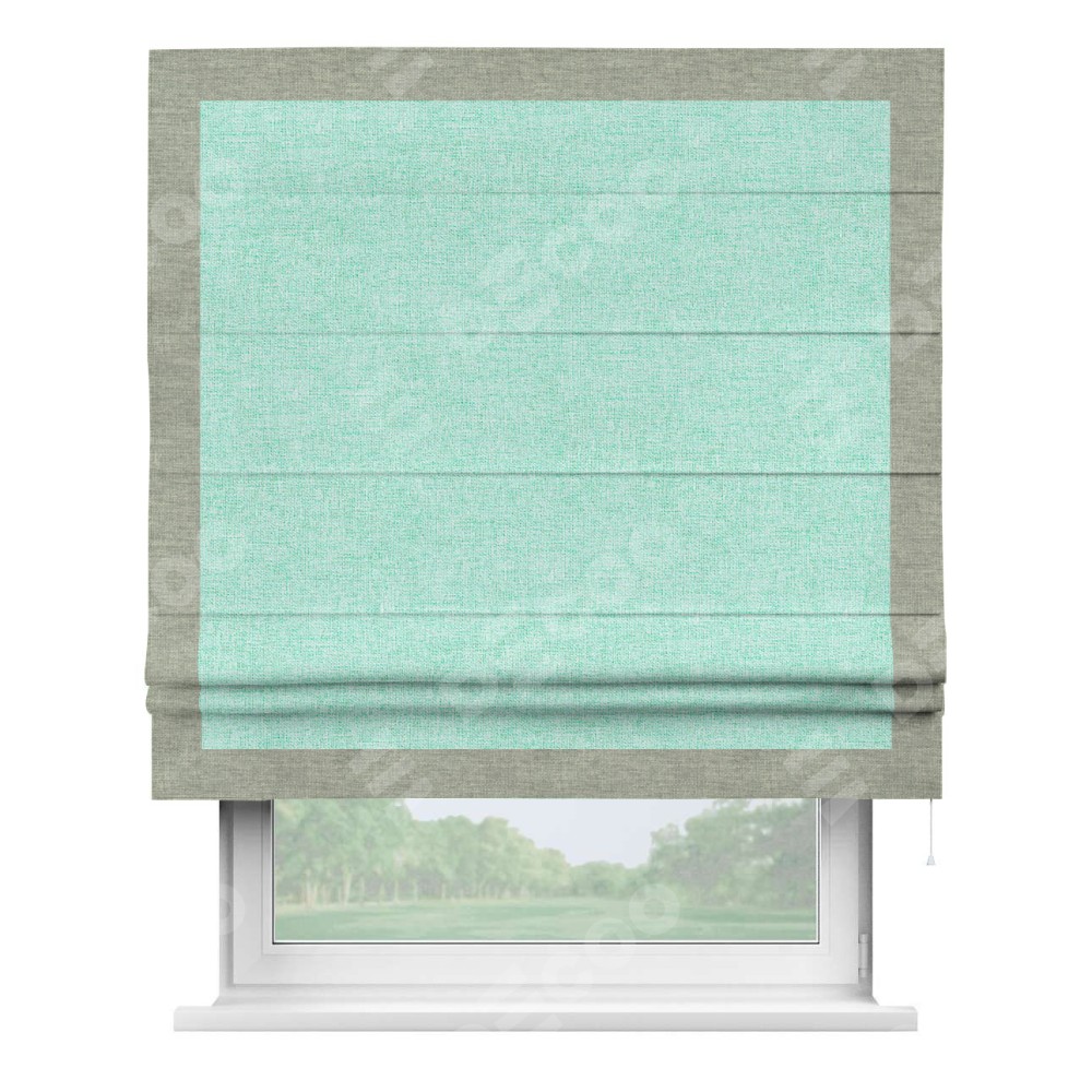 Римская штора пошита из ткани лён кашемир мятный, артикул: 21617, с отделкой кантом «Чесс» отличается своей уникальной деталью — наличием канта не только по бокам и снизу, но и сверху по всем краям шторы. Это придает шторе особенно аккуратный и завершенный вид, делая акцент на границах и форме шторы. Отделка кантом по всему периметру шторы усиливает её декоративные качества и подчеркивает строгую геометрию, что может быть особенно актуально для современных и минималистичных интерьеров.