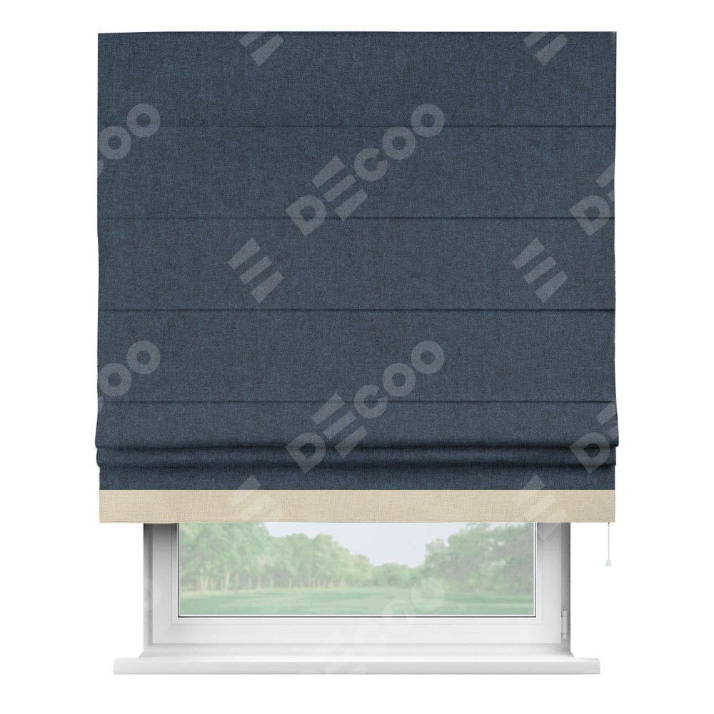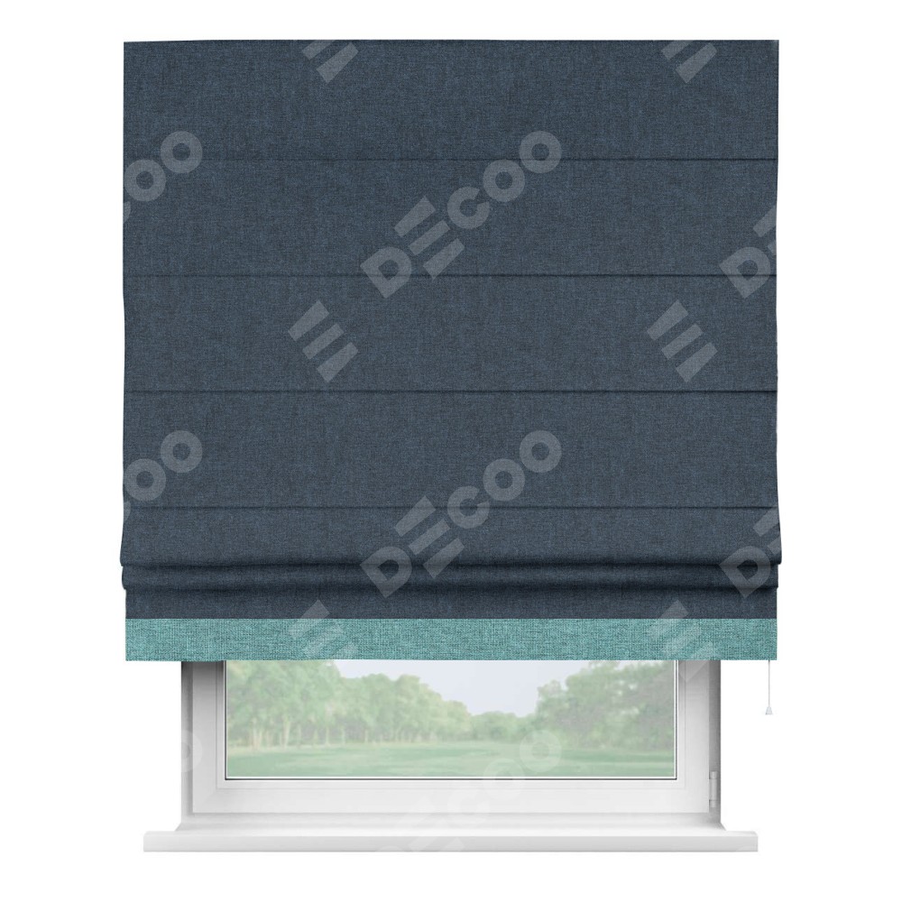 Римская штора пошита из ткани лён кашемир синий, артикул: 21623, с отделкой кантом «Джестер» выделяется своей уникальной особенностью — кантом, расположенным только снизу шторы. Этот дизайн добавляет оригинальности и игривости оконному оформлению, делая акцент на нижней части шторы и создавая интересный визуальный эффект. Отделка кантом на нижнем крае не только служит эстетической функции, но и способствует увеличению прочности и износостойкости ткани в этом месте.