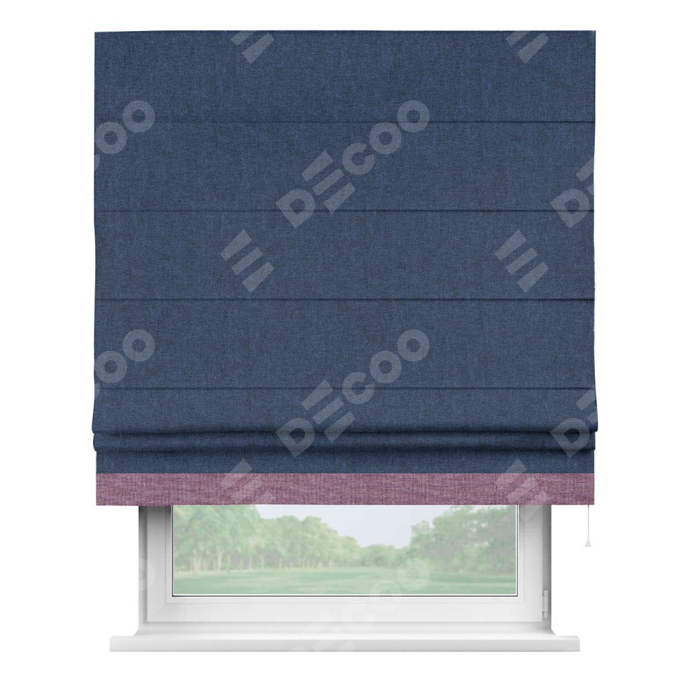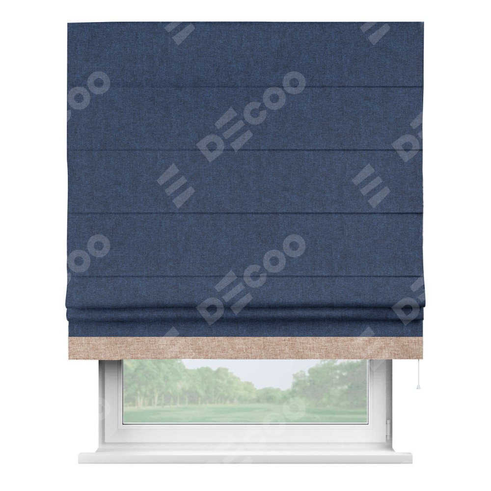 Римская штора пошита из ткани лён кашемир тёмно-синий, артикул: 17215, с отделкой кантом «Джестер» выделяется своей уникальной особенностью — кантом, расположенным только снизу шторы. Этот дизайн добавляет оригинальности и игривости оконному оформлению, делая акцент на нижней части шторы и создавая интересный визуальный эффект. Отделка кантом на нижнем крае не только служит эстетической функции, но и способствует увеличению прочности и износостойкости ткани в этом месте.