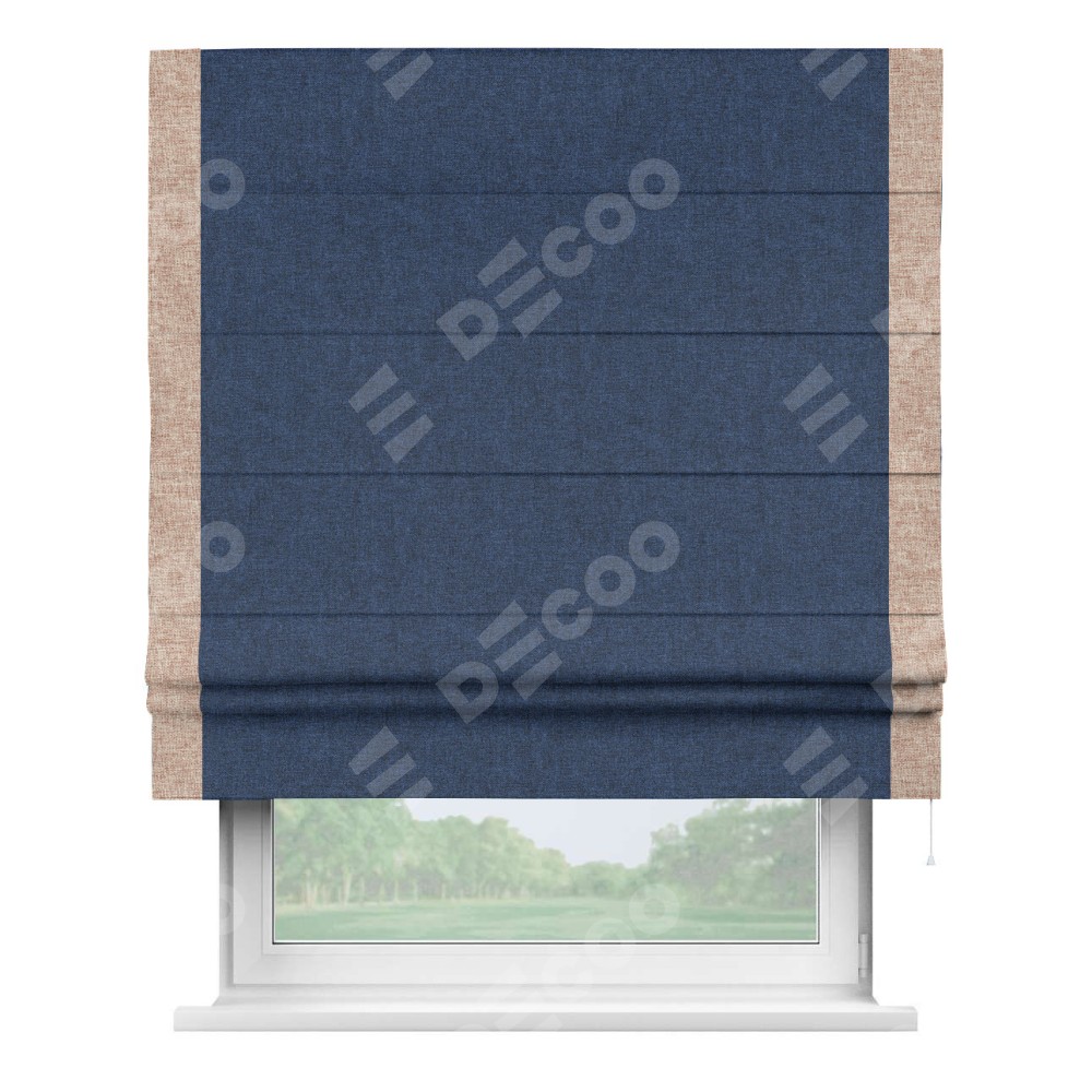 Римская штора пошита из ткани лён кашемир тёмно-синий, артикул: 17215, с отделкой кантом «Стрим Дуо» выделяется наличием кантов по обоим бокам шторы, слева и справа. Этот дизайн придает шторе аккуратный и завершенный вид, акцентируя вертикальные линии и визуально вытягивая окно в высоту. Отделка кантом по бокам не только украшает штору, но и служит практической функцией, укрепляя края и продлевая срок службы изделия.