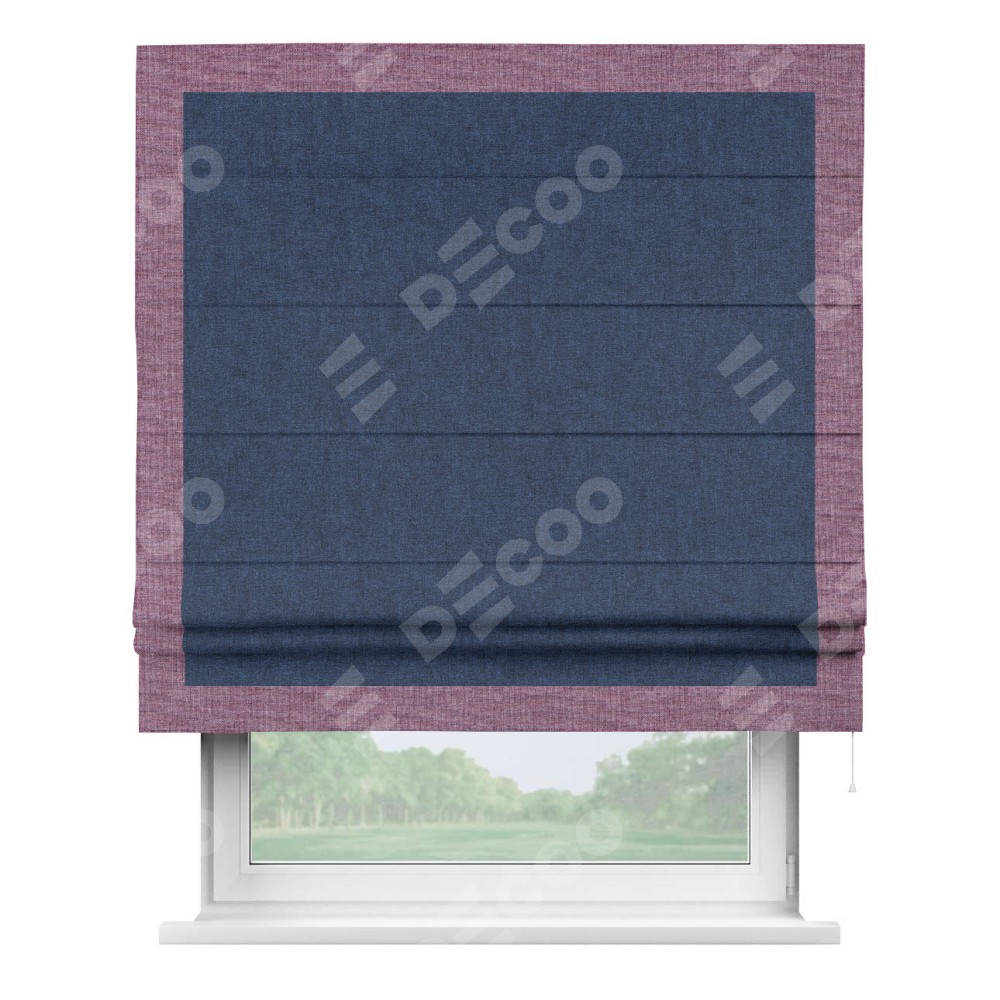 Римская штора пошита из ткани лён кашемир тёмно-синий, артикул: 17215, с отделкой кантом «Чесс» отличается своей уникальной деталью — наличием канта не только по бокам и снизу, но и сверху по всем краям шторы. Это придает шторе особенно аккуратный и завершенный вид, делая акцент на границах и форме шторы. Отделка кантом по всему периметру шторы усиливает её декоративные качества и подчеркивает строгую геометрию, что может быть особенно актуально для современных и минималистичных интерьеров.