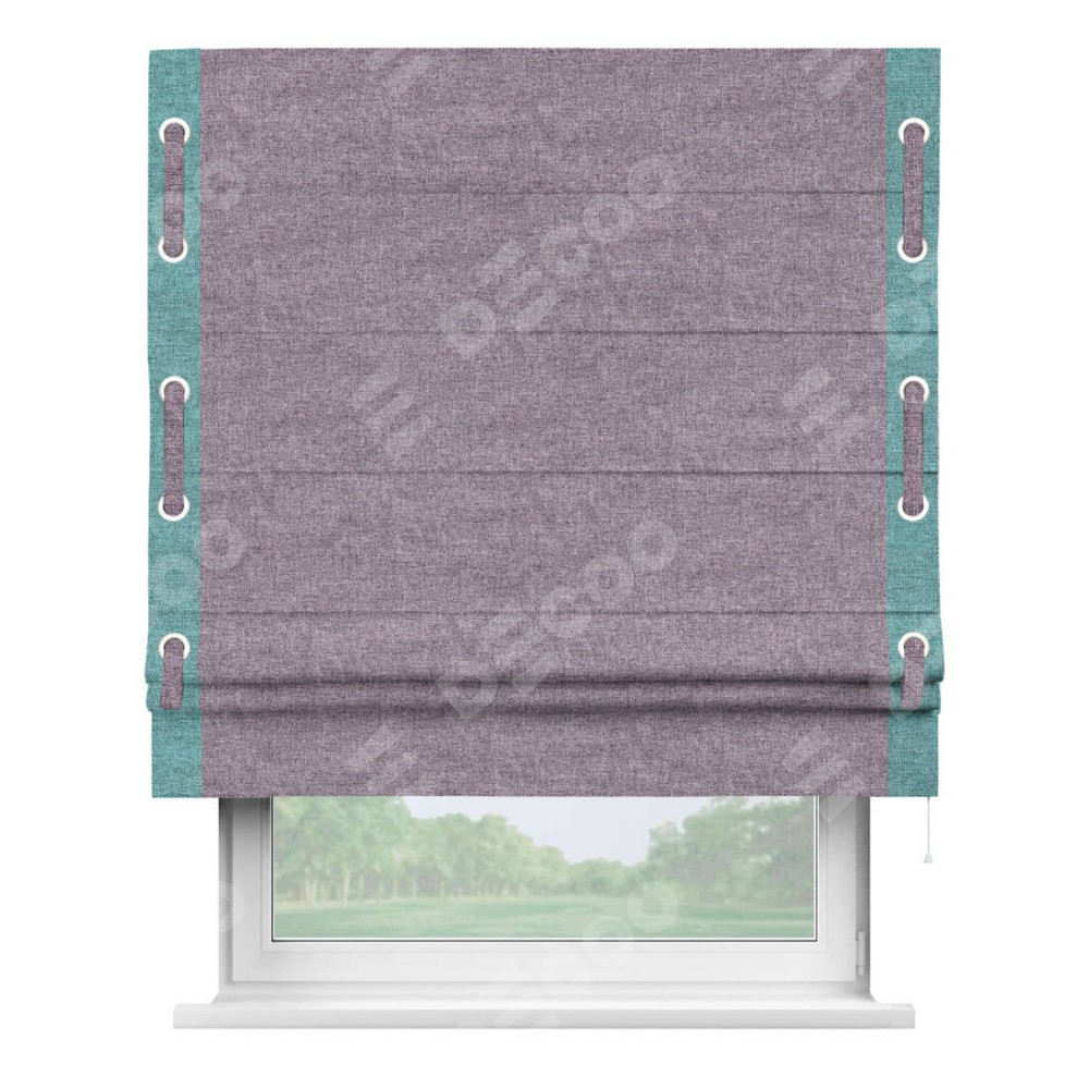 Римская штора «Кортин» для проёма, лён кашемир фиолетовый, с кантом Стрим Дуо (люверсы с пояском)