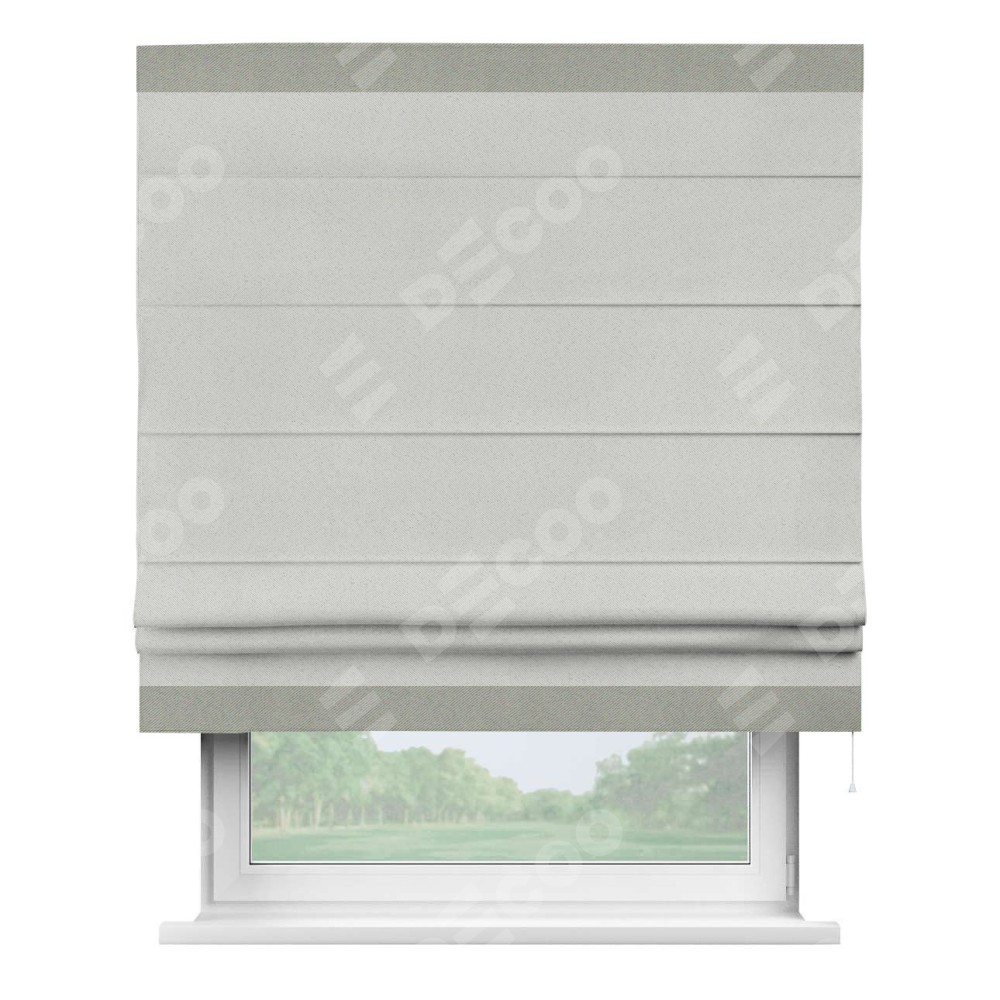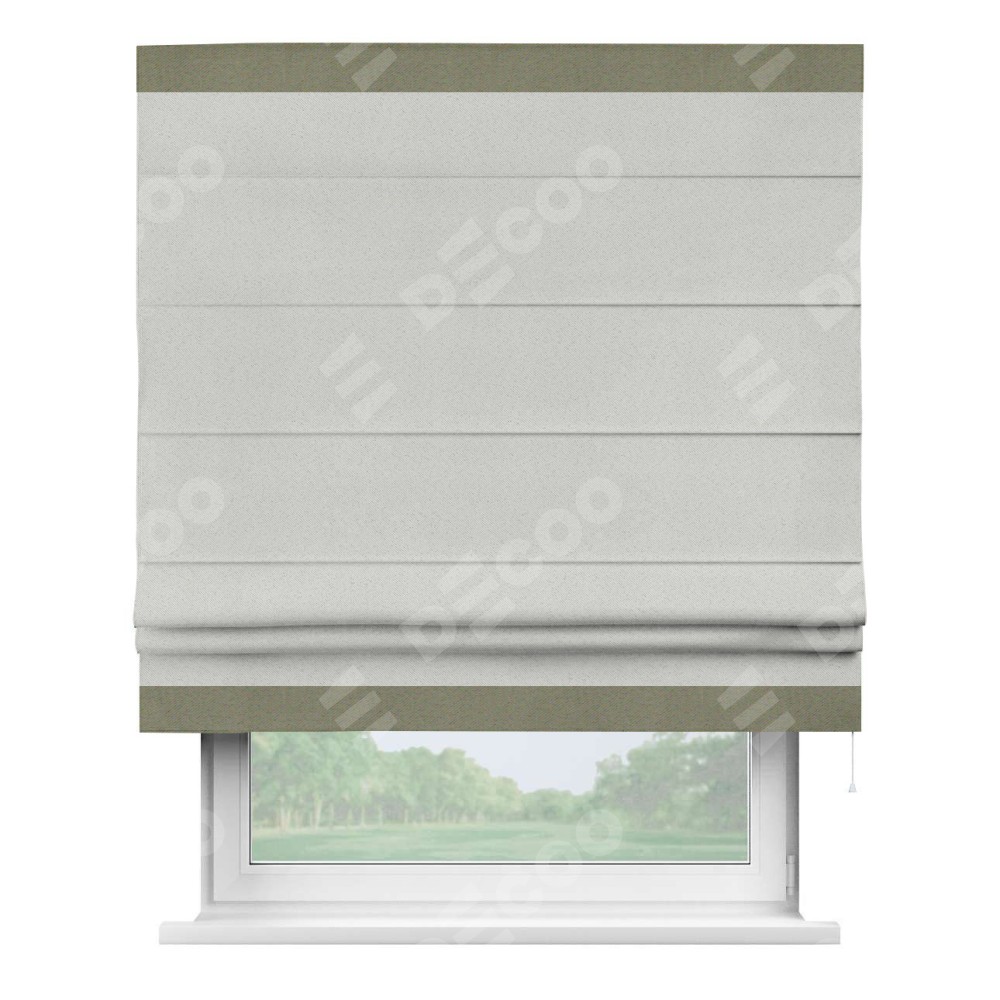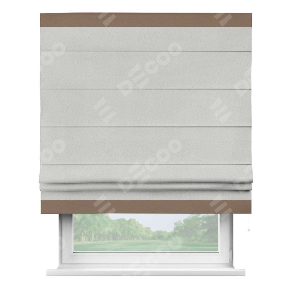 Римская штора пошита из ткани однотонный блэкаут милк, артикул: 23, с отделкой кантом «Горизонт» предлагает уникальное дизайнерское решение, при котором кант располагается только вверху и снизу шторы. Такое решение делает акцент на горизонтальных линиях, визуально расширяя пространство и придавая окну более строгий и организованный вид. Отделка кантом в этих ключевых местах не только украшает штору, но и способствует её долговечности, защищая наиболее уязвимые к износу края.