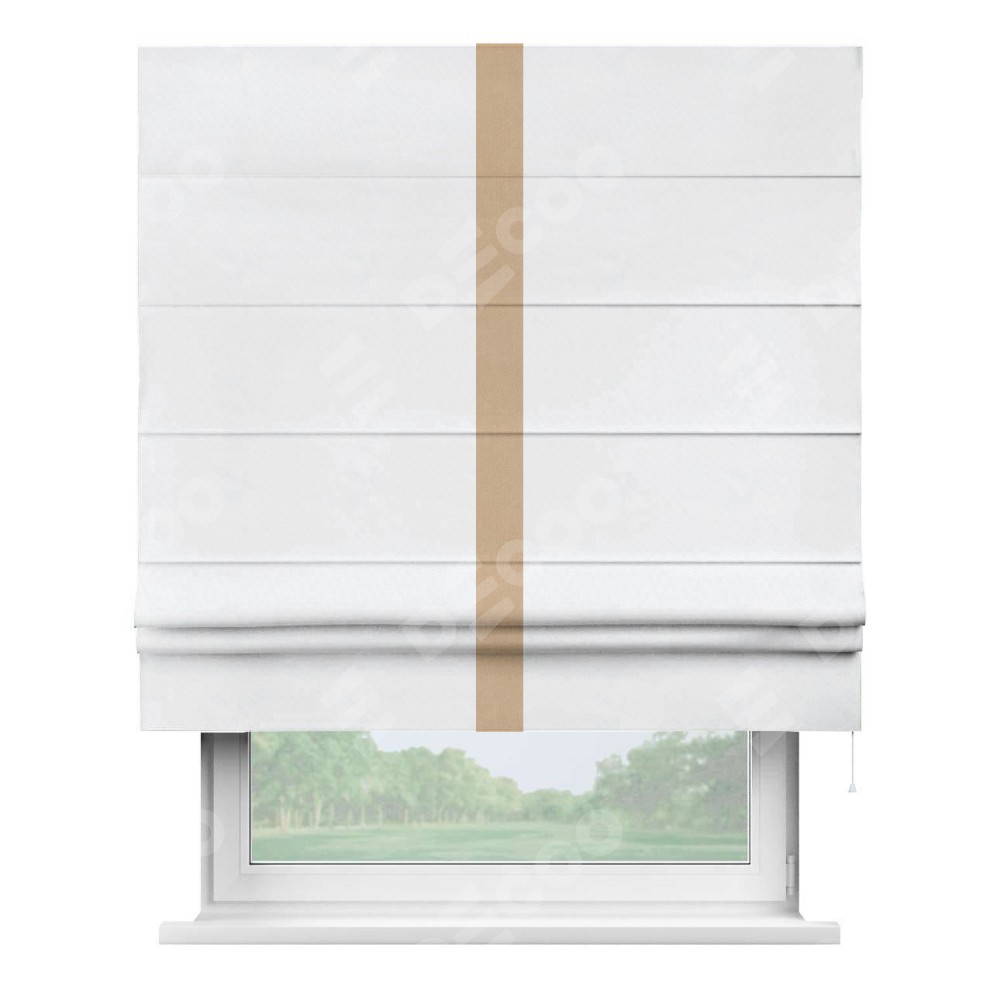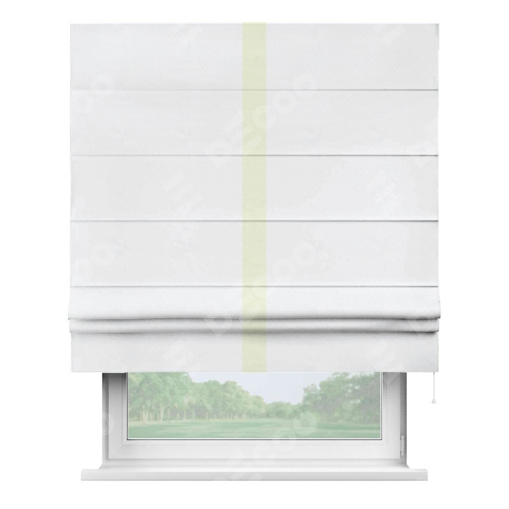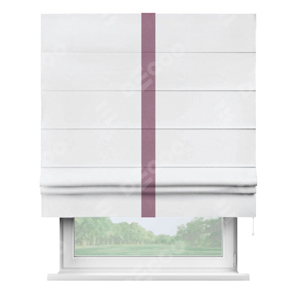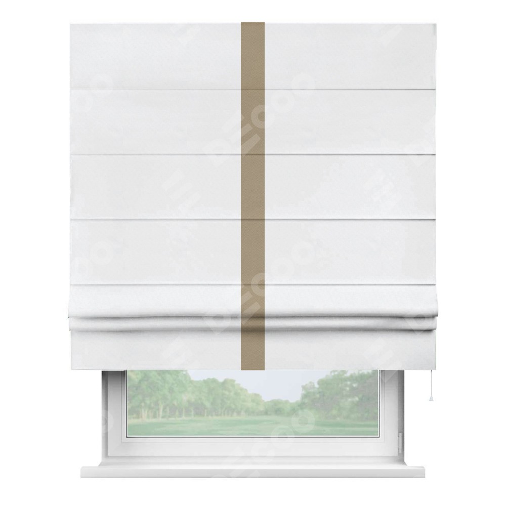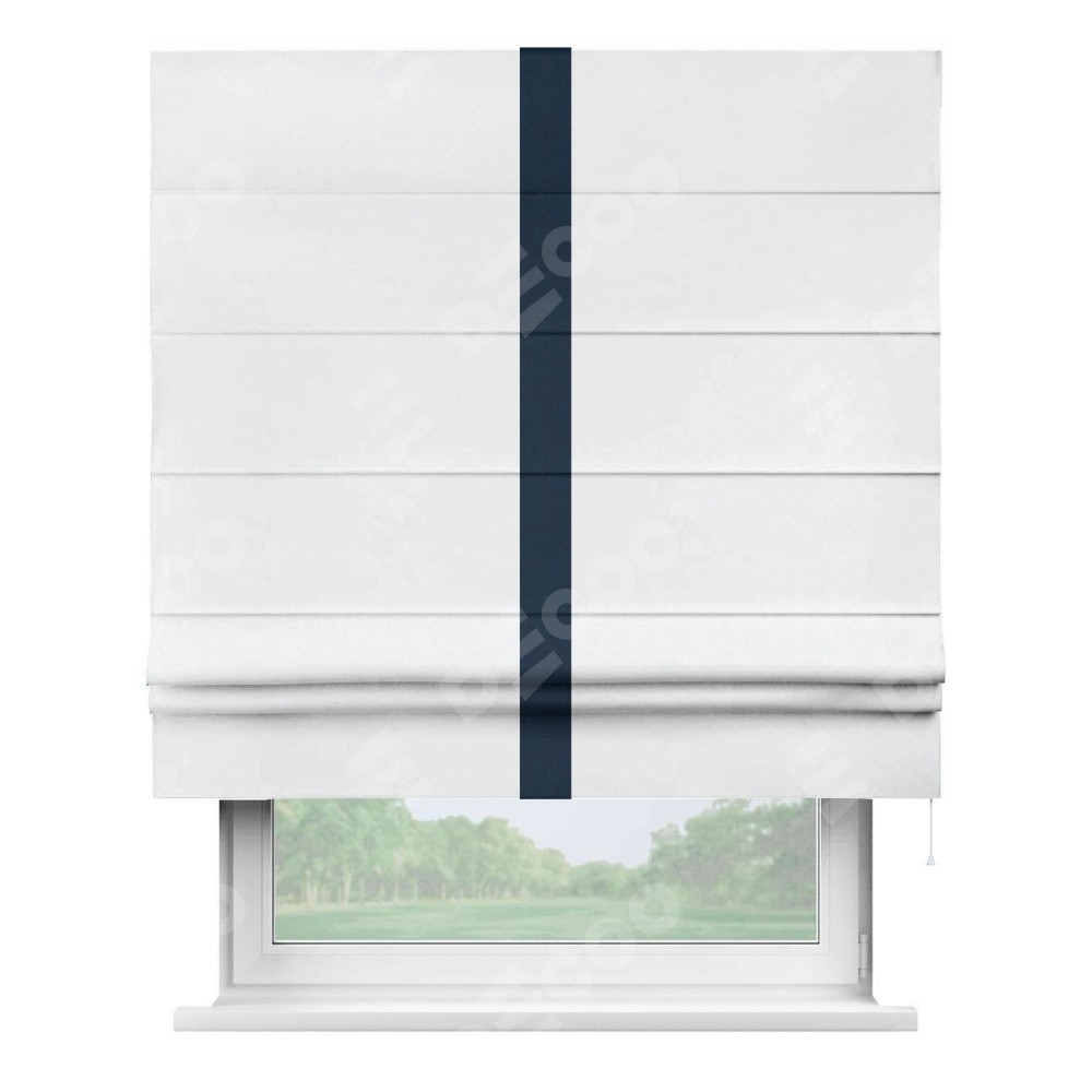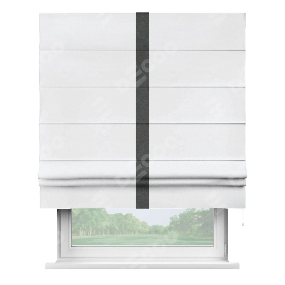 Римская штора пошита из ткани вельвет белоснежный, артикул: 92698, с отделкой кантом «Хайвэй» представляет собой уникальное и смелое дизайнерское решение, где кант расположен вертикально посередине шторы. Этот дизайн не только выделяет штору среди других вариантов оформления окон, но и создает интересный визуальный акцент, привлекая внимание к центру окна и разделяя штору на визуальные зоны. Такой нестандартный подход добавляет динамичности интерьеру и может быть использован для подчеркивания особенностей оформления помещения.