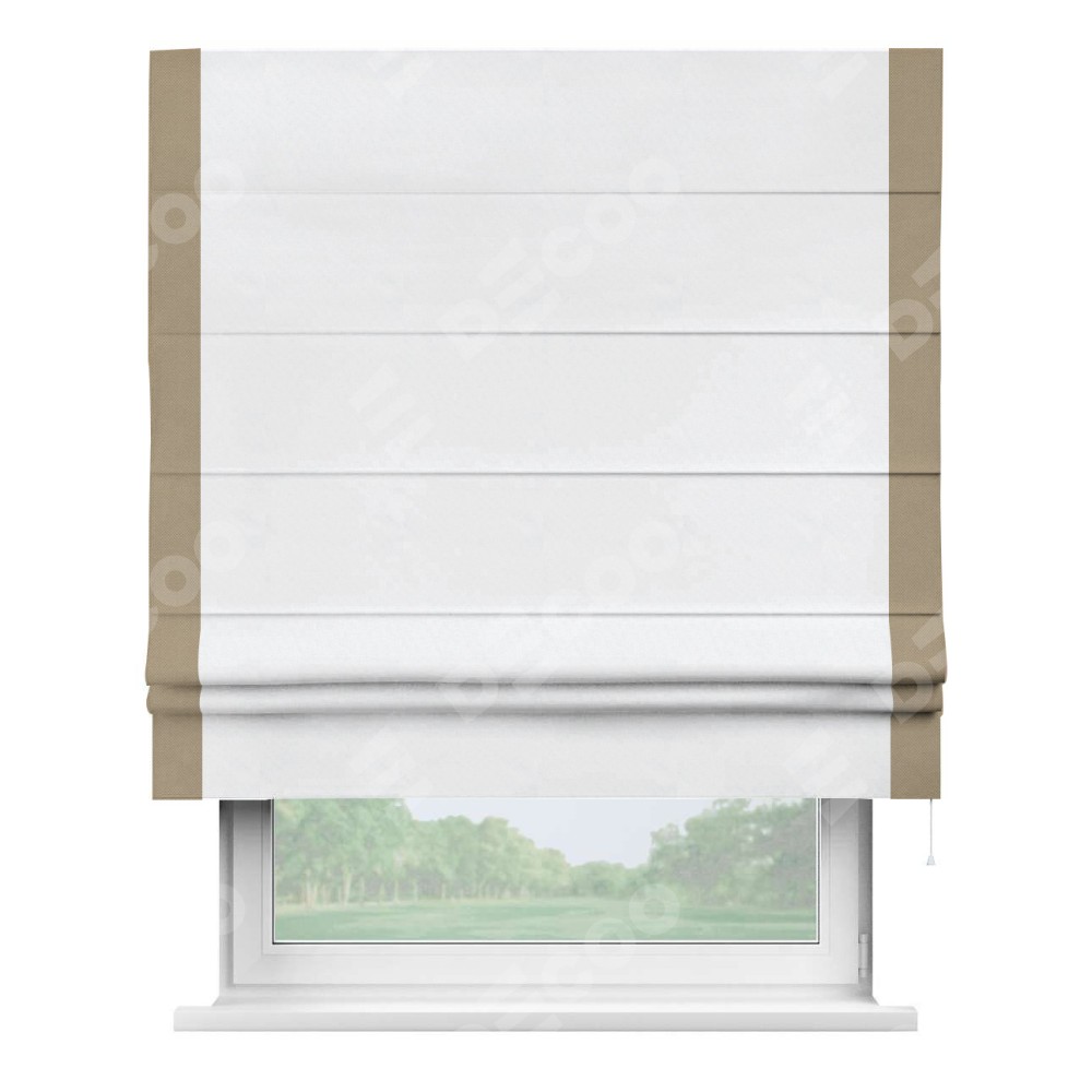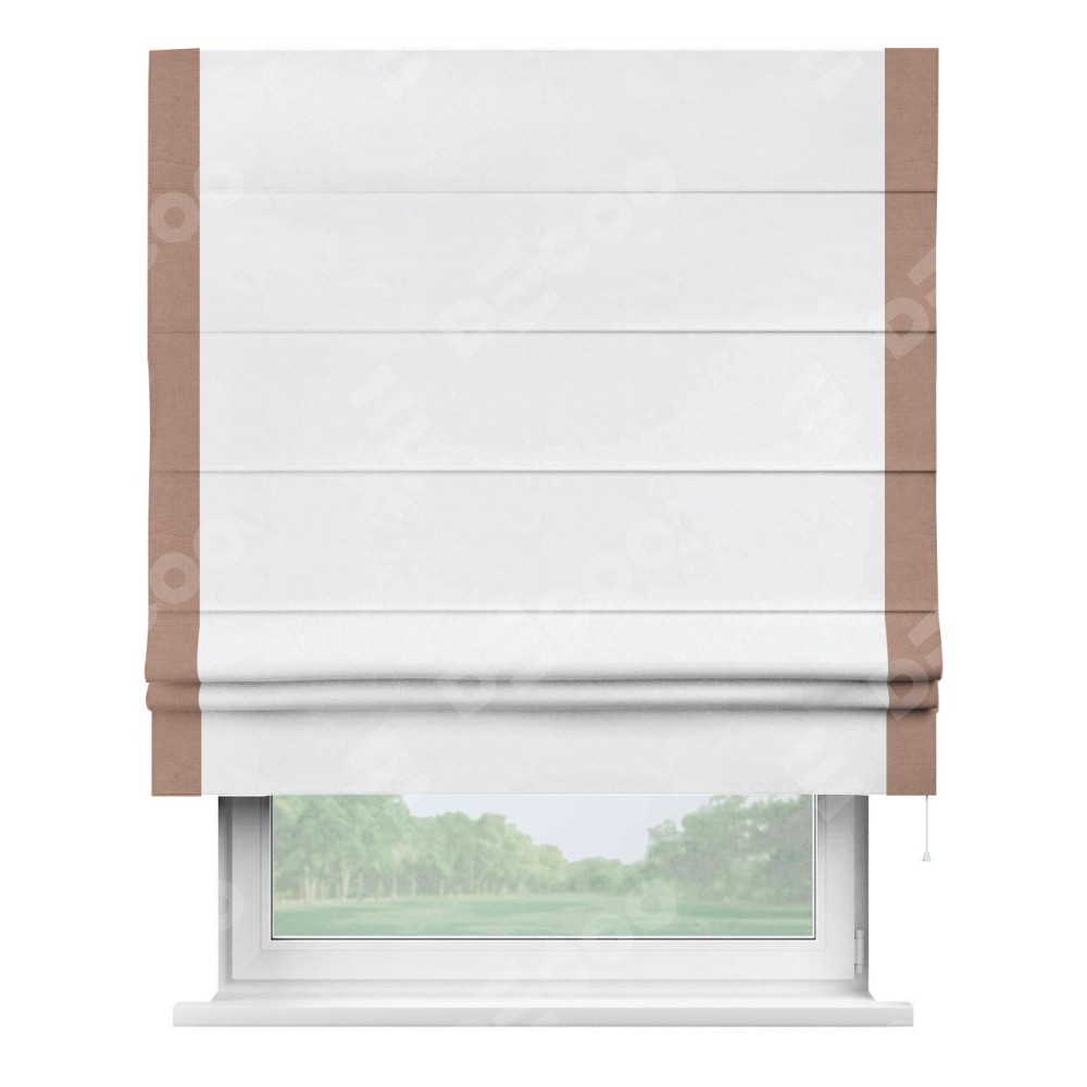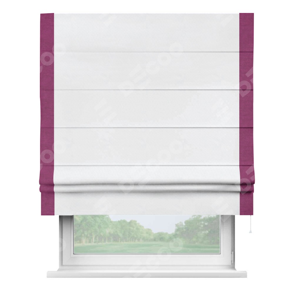 Римская штора пошита из ткани вельвет белоснежный, артикул: 92698, с отделкой кантом «Стрим Дуо» выделяется наличием кантов по обоим бокам шторы, слева и справа. Этот дизайн придает шторе аккуратный и завершенный вид, акцентируя вертикальные линии и визуально вытягивая окно в высоту. Отделка кантом по бокам не только украшает штору, но и служит практической функцией, укрепляя края и продлевая срок службы изделия.