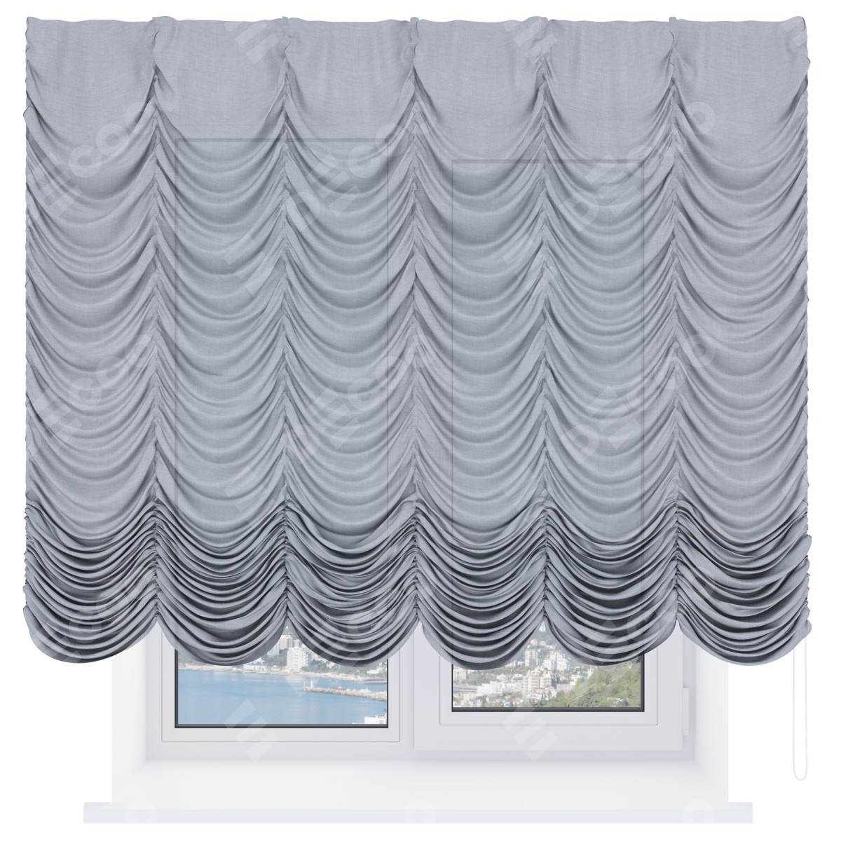 Французская штора производителя «Cortin», используется для проёма, пошита из ткани лён серый, артикул ткани 7440. Имеет универсальный механизм и подходит для монтажа: на потолок и на стену.