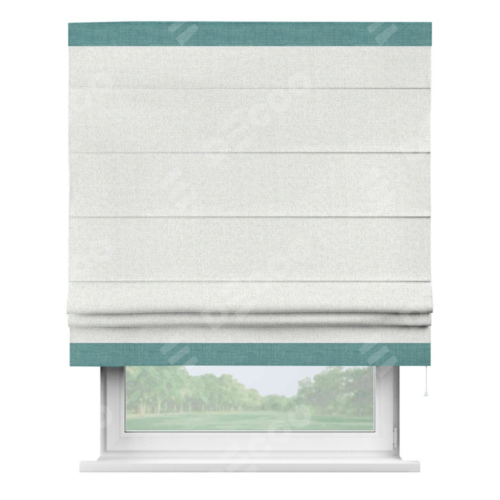 Римская штора пошита из ткани лён шампань, артикул: 91399, с отделкой кантом «Горизонт» предлагает уникальное дизайнерское решение, при котором кант располагается только вверху и снизу шторы. Такое решение делает акцент на горизонтальных линиях, визуально расширяя пространство и придавая окну более строгий и организованный вид. Отделка кантом в этих ключевых местах не только украшает штору, но и способствует её долговечности, защищая наиболее уязвимые к износу края.
