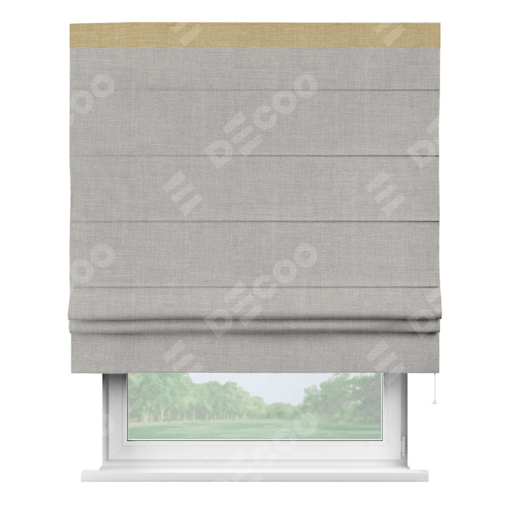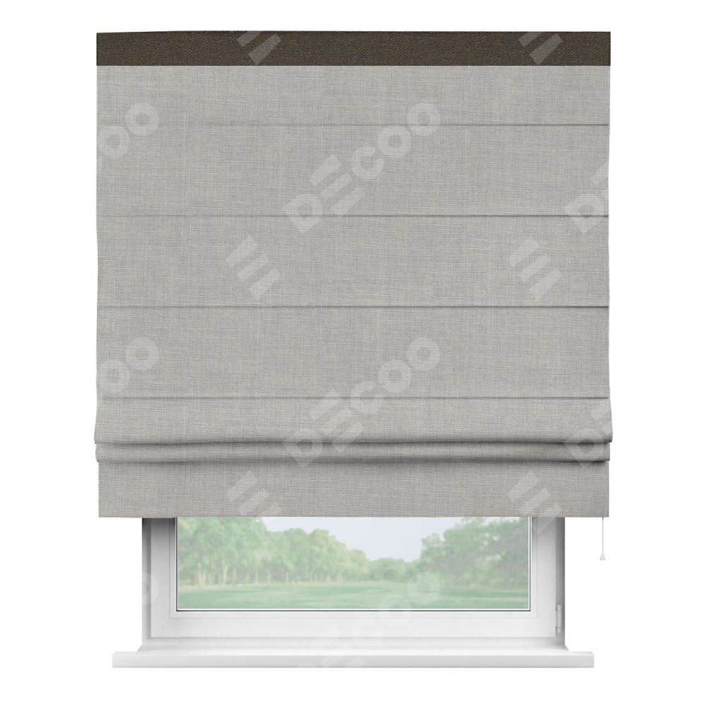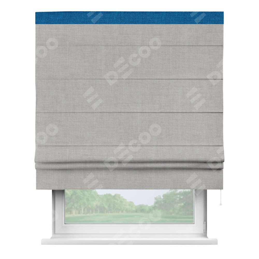 Римская штора пошита из ткани лён серый, артикул: 91410, с отделкой кантом «Кинг» отличается своей необычной особенностью: кант располагается исключительно сверху шторы. Такой дизайн делает акцент на верхней части окна, визуально поднимая потолок и придавая интерьеру более возвышенный и изысканный вид. Отделка кантом на верхней кромке не только украшает штору, но и может служить дополнительной защитой от износа в месте наибольшего контакта с механизмом управления шторой.