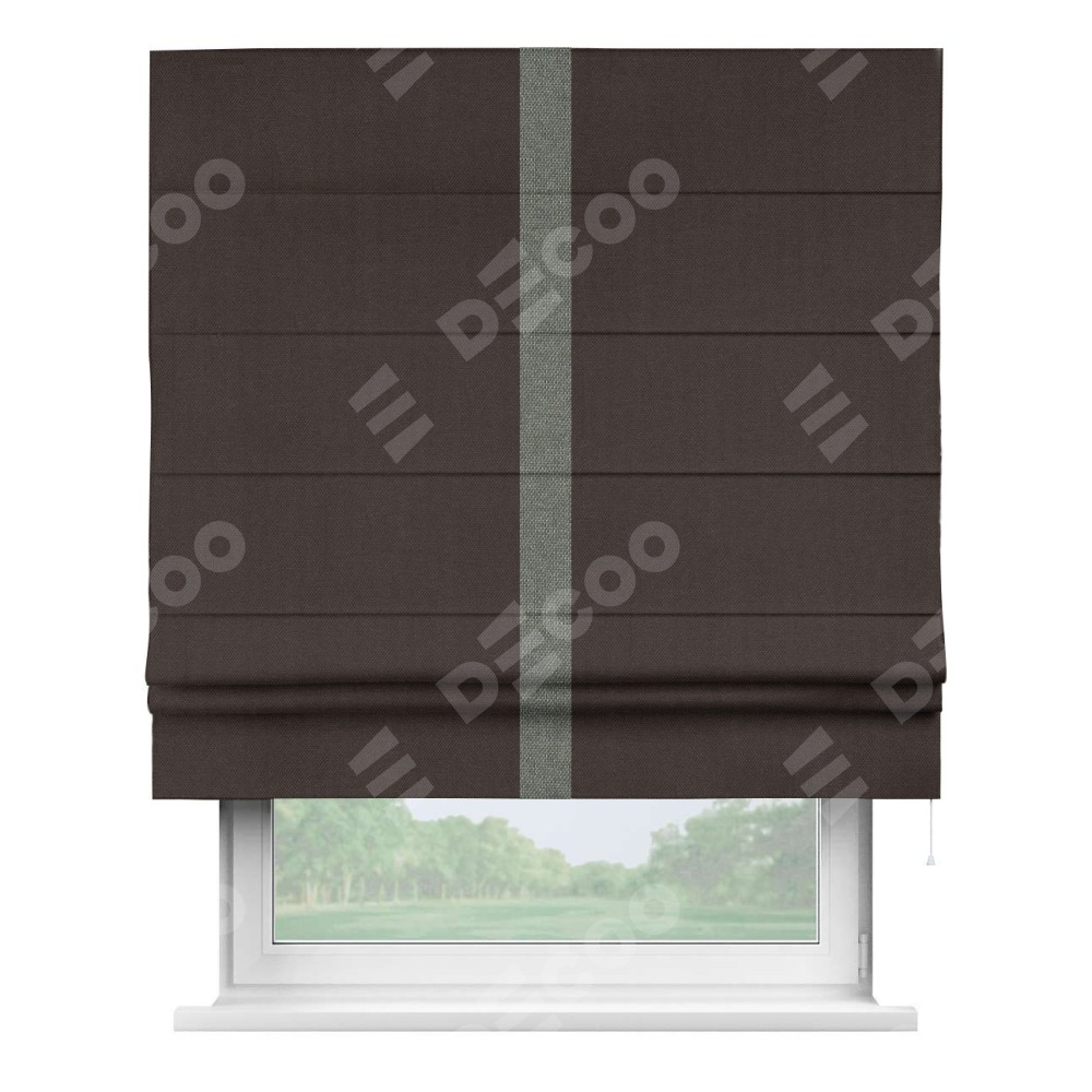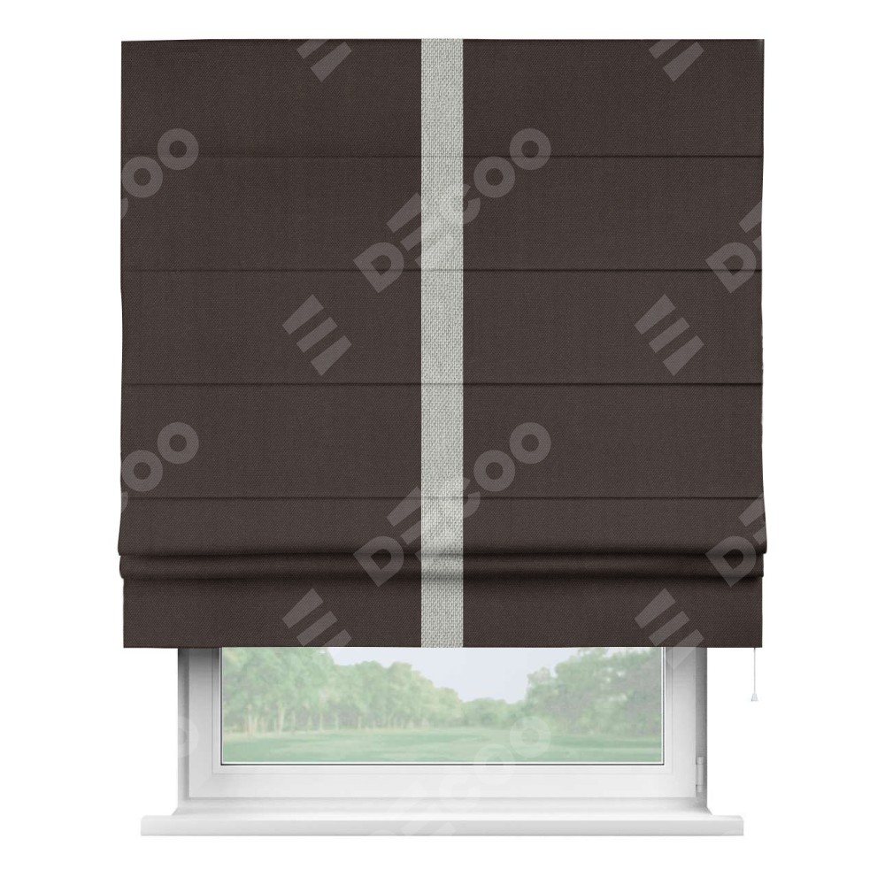 Римская штора пошита из ткани лён димаут венге, артикул: 91001, с отделкой кантом «Хайвэй» представляет собой уникальное и смелое дизайнерское решение, где кант расположен вертикально посередине шторы. Этот дизайн не только выделяет штору среди других вариантов оформления окон, но и создает интересный визуальный акцент, привлекая внимание к центру окна и разделяя штору на визуальные зоны. Такой нестандартный подход добавляет динамичности интерьеру и может быть использован для подчеркивания особенностей оформления помещения.