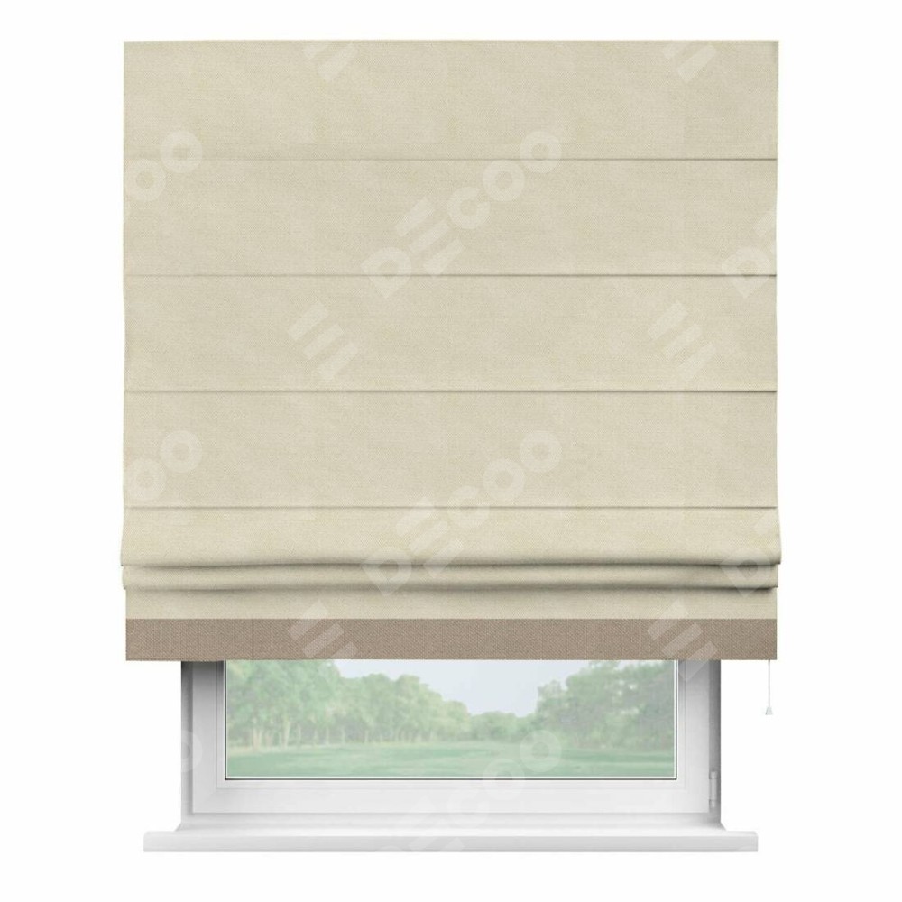 Римская штора производителя «Cortin», используется для проёма, пошита из ткани лён димаут бежевый, артикул 83023. Отделка шторы кантом «Джестер», ткань для канта используется из льна димаут разной расцветки на выбор. Имеет универсальный механизм и подходит для монтажа: на потолок, на стену и в нишу.