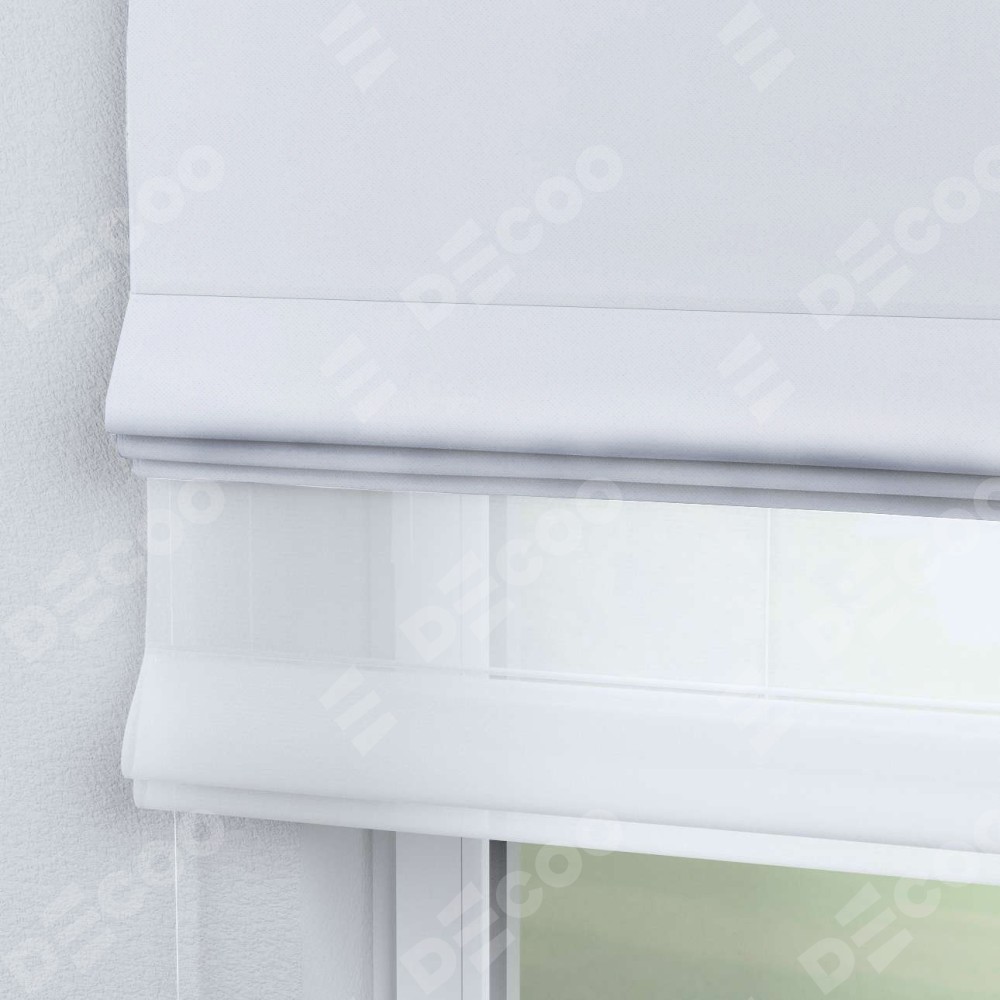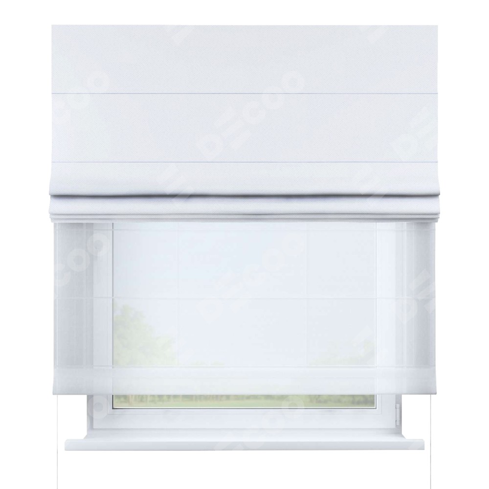 Двойная римская штора «День-ночь» от производителя Cortin предназначена для использования в проёмах. Эта штора уникальна тем, что состоит из двух полотен. На лицевой стороне находится лён димаут белый (артикул: 28), обеспечивающий эффективное затемнение. В комплект также входит вторая ткань — легкий белый тюль (артикул: V-01), который добавляет изящества и легкости оформлению окна. Кроме того, доступны и другие разновидности ткани тюль, выбор которых доступен по  ссылке .