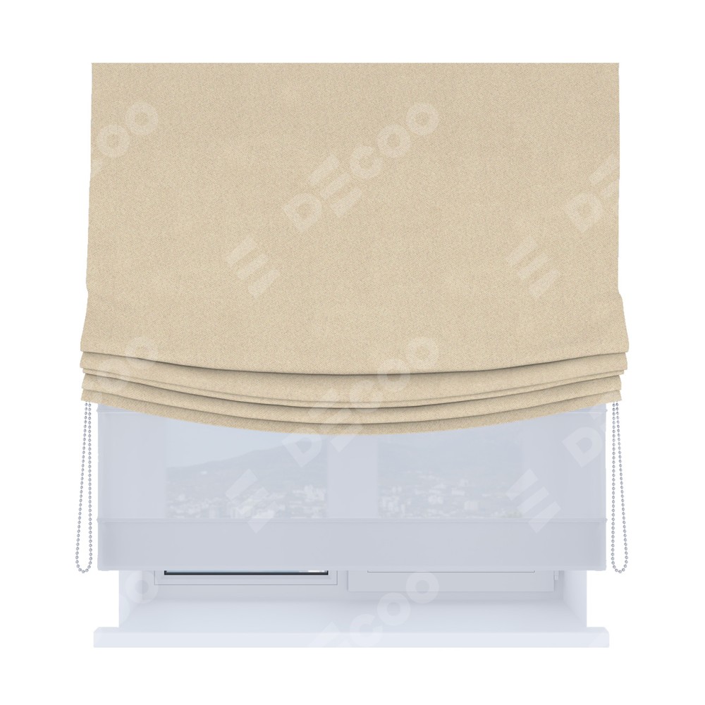 Двойная римская штора «День-ночь» от производителя Cortin предназначена для использования в проёмах. Эта штора уникальна тем, что состоит из двух полотен. На лицевой стороне находится однотонный блэкаут кофейно-бежевый (артикул: 91566−1), обеспечивающий эффективное затемнение. В комплект также входит вторая ткань — легкий белый тюль (артикул: V-01), который добавляет изящества и легкости оформлению окна. Кроме того, доступны и другие разновидности ткани тюль, выбор которых доступен по  ссылке .