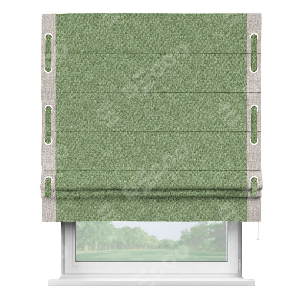 Римская штора «Cortin» для проёма, лён димаут светло-салатовый с кантом Стрим Дуо (люверсы с пояском)