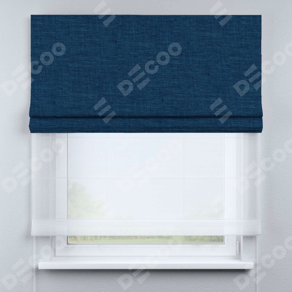 Двойная римская штора «День-ночь» от производителя Cortin предназначена для использования в проёмах. Эта штора уникальна тем, что состоит из двух полотен. На лицевой стороне находится лён синий (артикул: 104496), обеспечивающий эффективное затемнение. В комплект также входит вторая ткань — легкий белый тюль (артикул: V-01), который добавляет изящества и легкости оформлению окна. Кроме того, доступны и другие разновидности ткани тюль, выбор которых доступен по ссылке .