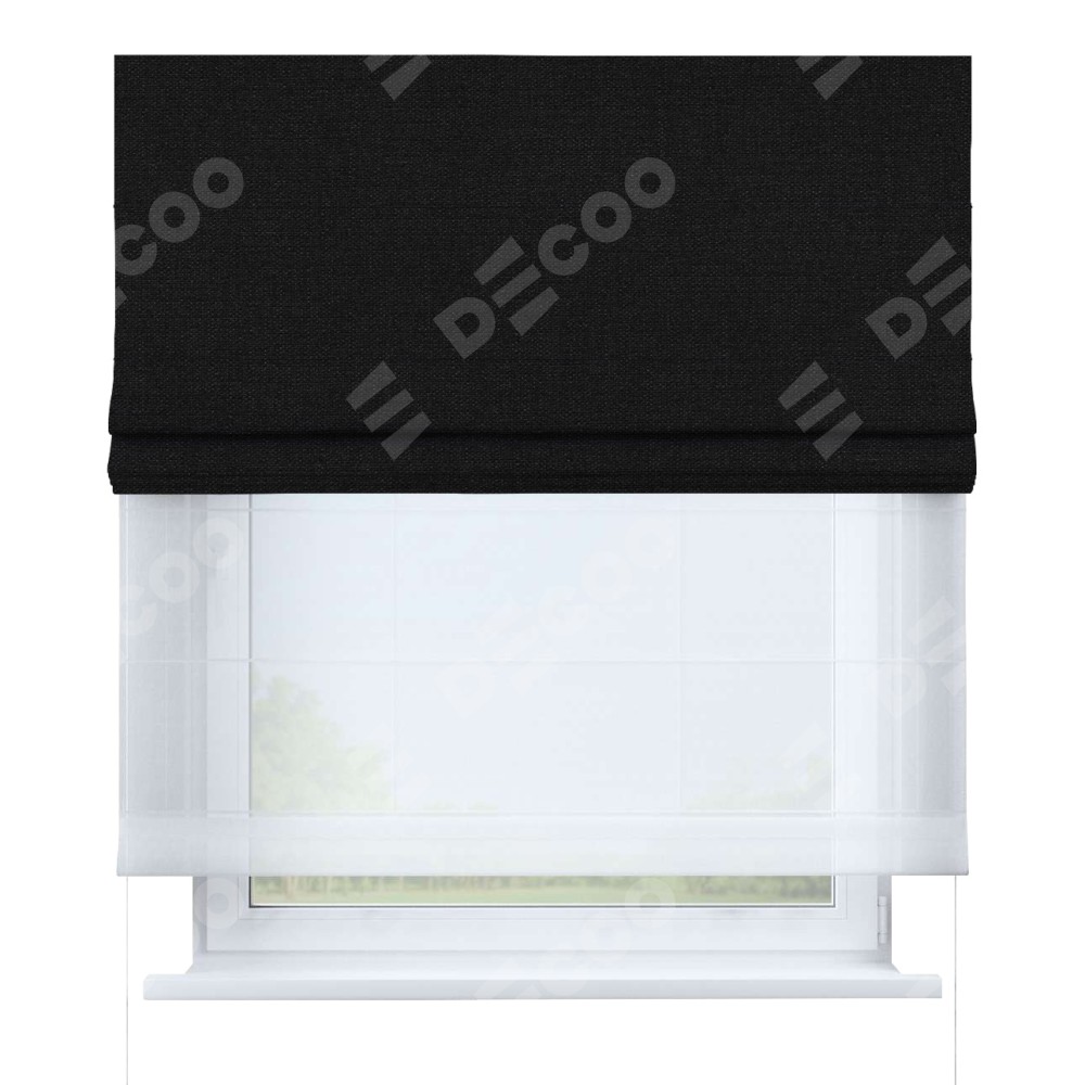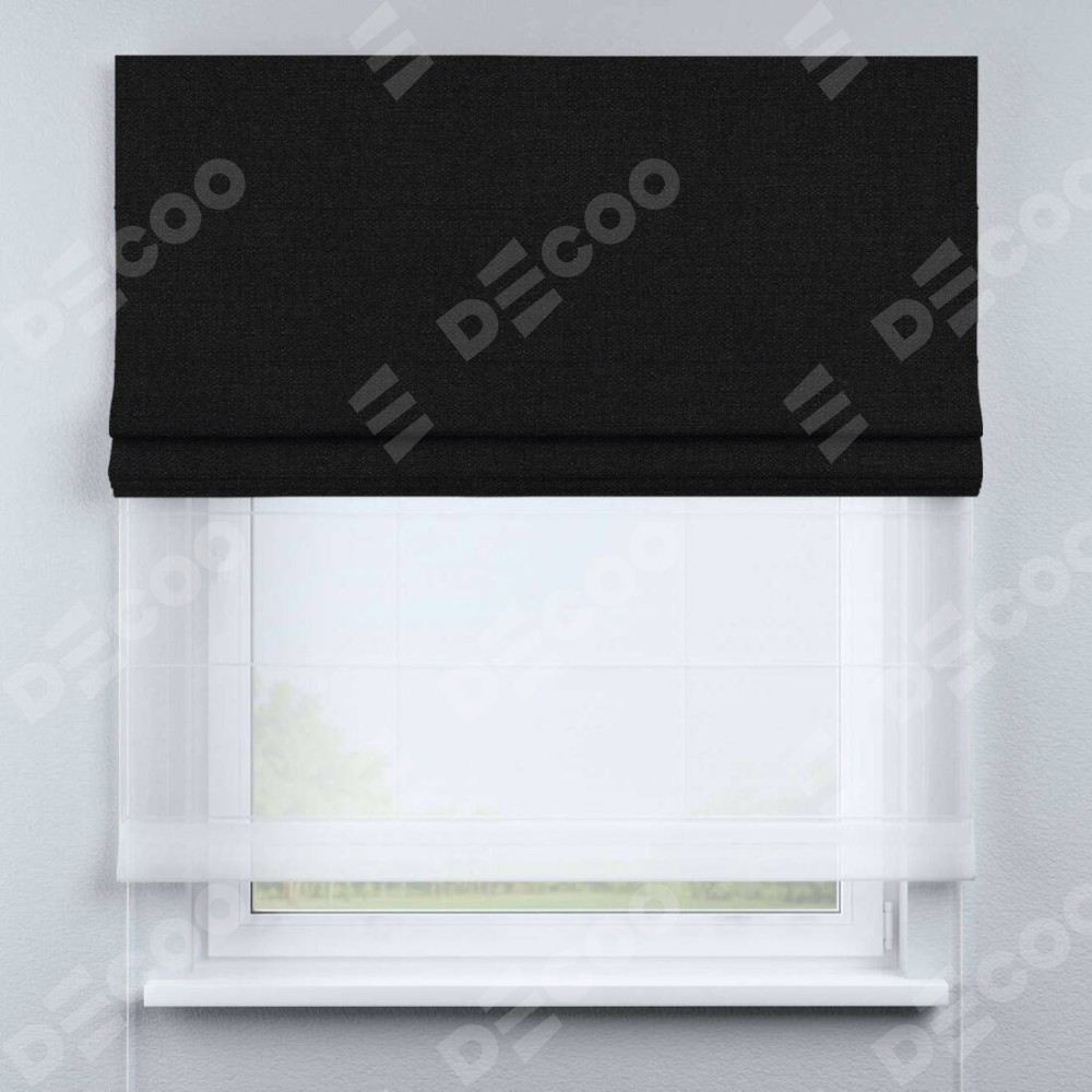 Двойная римская штора «День-ночь» от производителя Cortin предназначена для использования в проёмах. Эта штора уникальна тем, что состоит из двух полотен. На лицевой стороне находится лён черный (артикул: 140815), обеспечивающий эффективное затемнение. В комплект также входит вторая ткань — легкий белый тюль (артикул: V-01), который добавляет изящества и легкости оформлению окна. Кроме того, доступны и другие разновидности ткани тюль, выбор которых доступен по  ссылке .