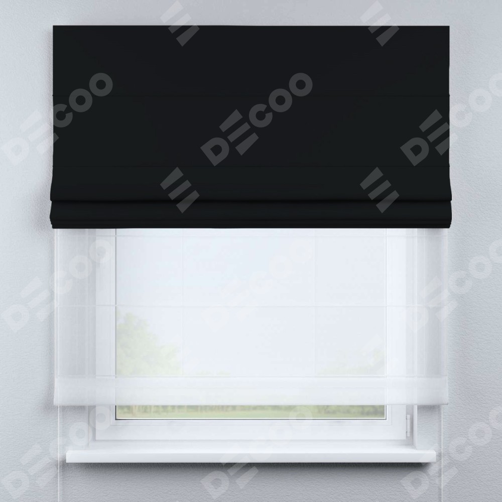 Двойная римская штора «День-ночь» от производителя Cortin предназначена для использования в проёмах. Эта штора уникальна тем, что состоит из двух полотен. На лицевой стороне находится однотонный блэкаут черный (артикул: 37), обеспечивающий эффективное затемнение. В комплект также входит вторая ткань — легкий белый тюль (артикул: V-01), который добавляет изящества и легкости оформлению окна. Кроме того, доступны и другие разновидности ткани тюль, выбор которых доступен по  ссылке .