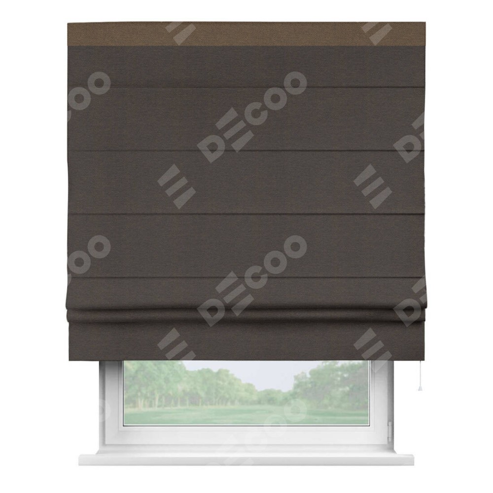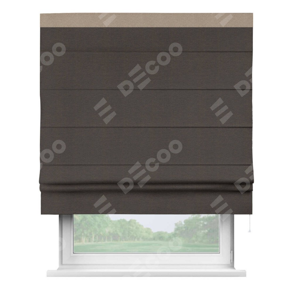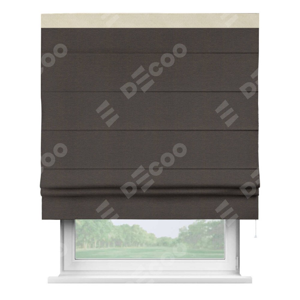 Римская штора производителя «Cortin», используется для проёма, пошита из ткани лён димаут венге, артикул 85410. Отделка шторы кантом «Кинг», ткань для канта используется из льна димаут разной расцветки на выбор. Имеет универсальный механизм и подходит для монтажа: на потолок, на стену и в нишу.