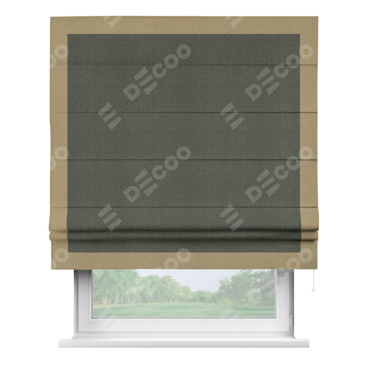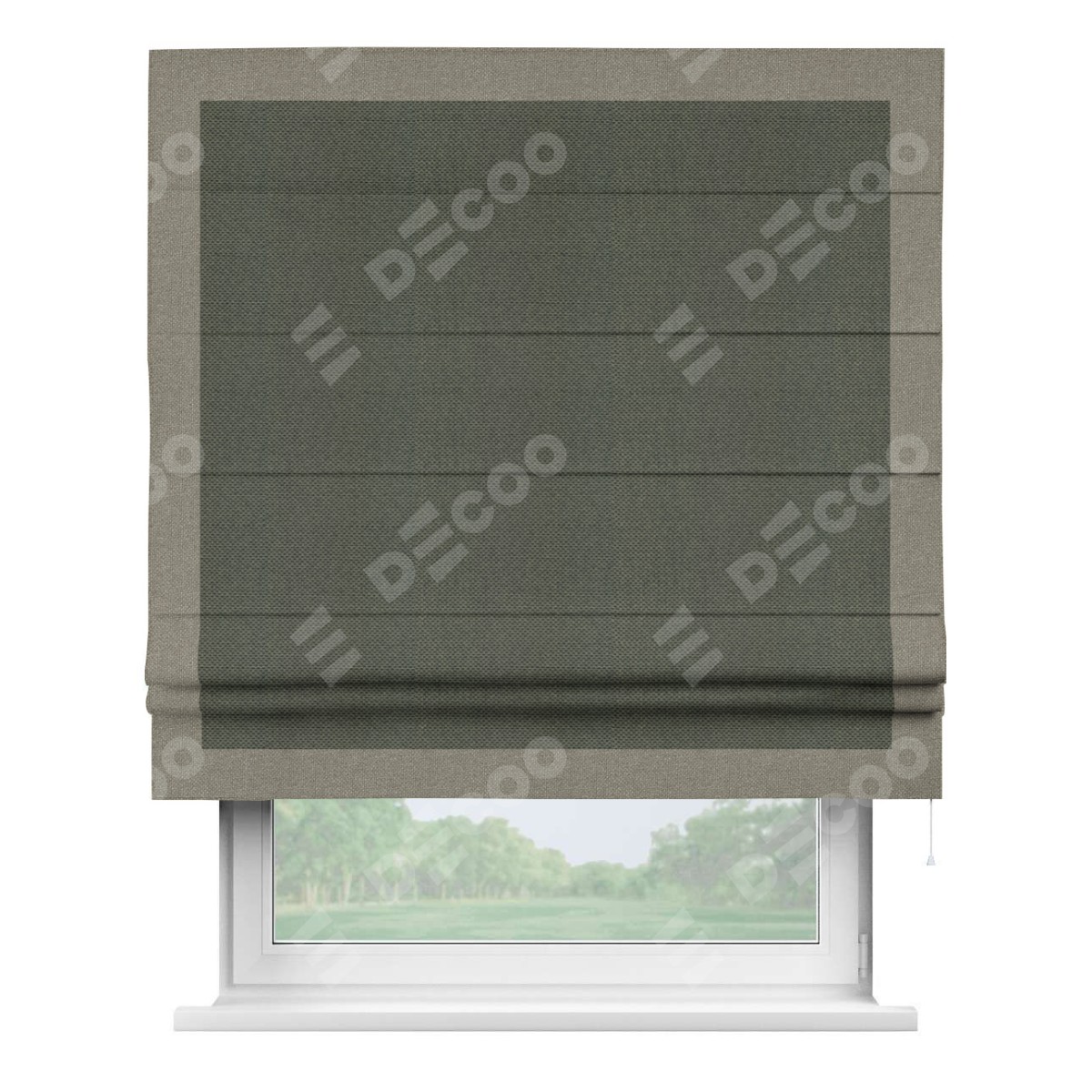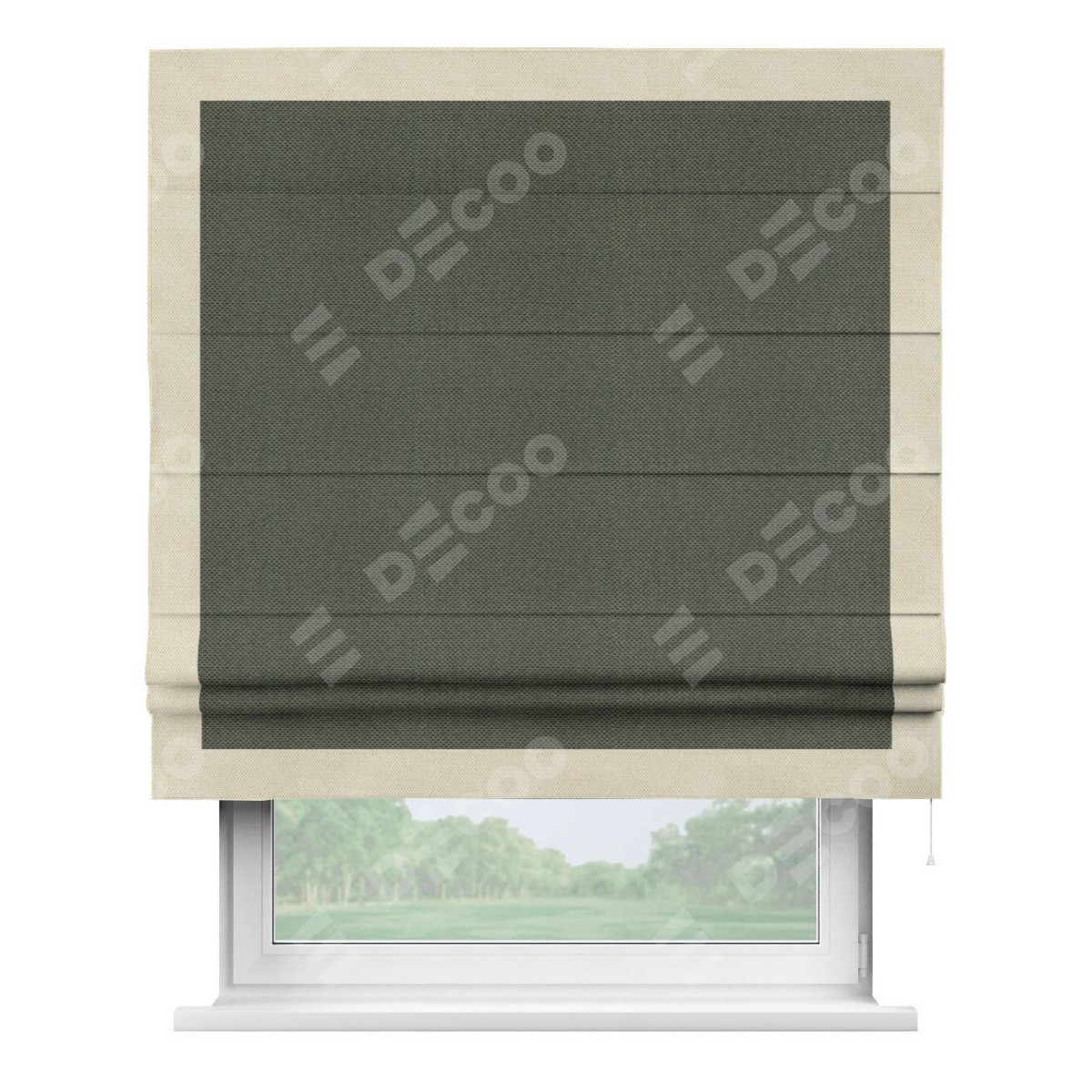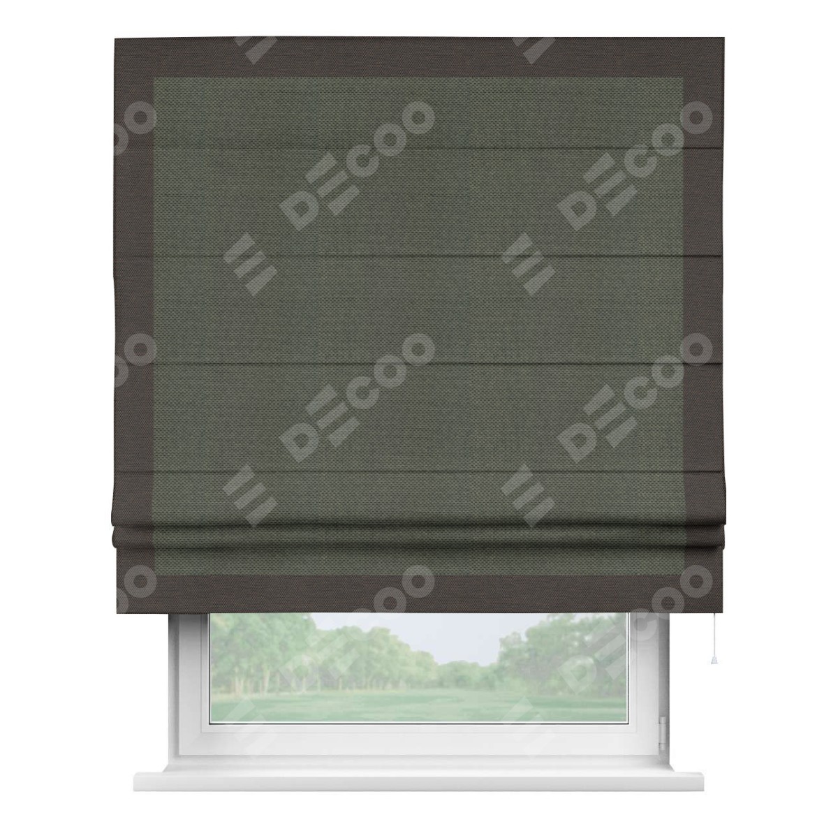 Римская штора производителя «Cortin», используется для проёма, пошита из ткани лён димаут графит, артикул 27. Отделка шторы кантом «Чесс», ткань для канта используется из льна димаут разной расцветки на выбор. Имеет универсальный механизм и подходит для монтажа: на потолок, на стену и в нишу.