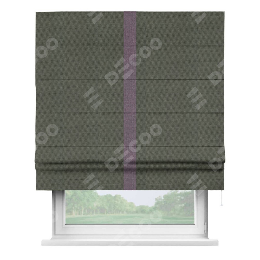 Римская штора производителя «Cortin», используется для проёма, пошита из ткани лён димаут графит, артикул 27. Отделка шторы кантом «Хайвэй», ткань для канта используется из льна димаут разной расцветки на выбор. Имеет универсальный механизм и подходит для монтажа: на потолок, на стену и в нишу.