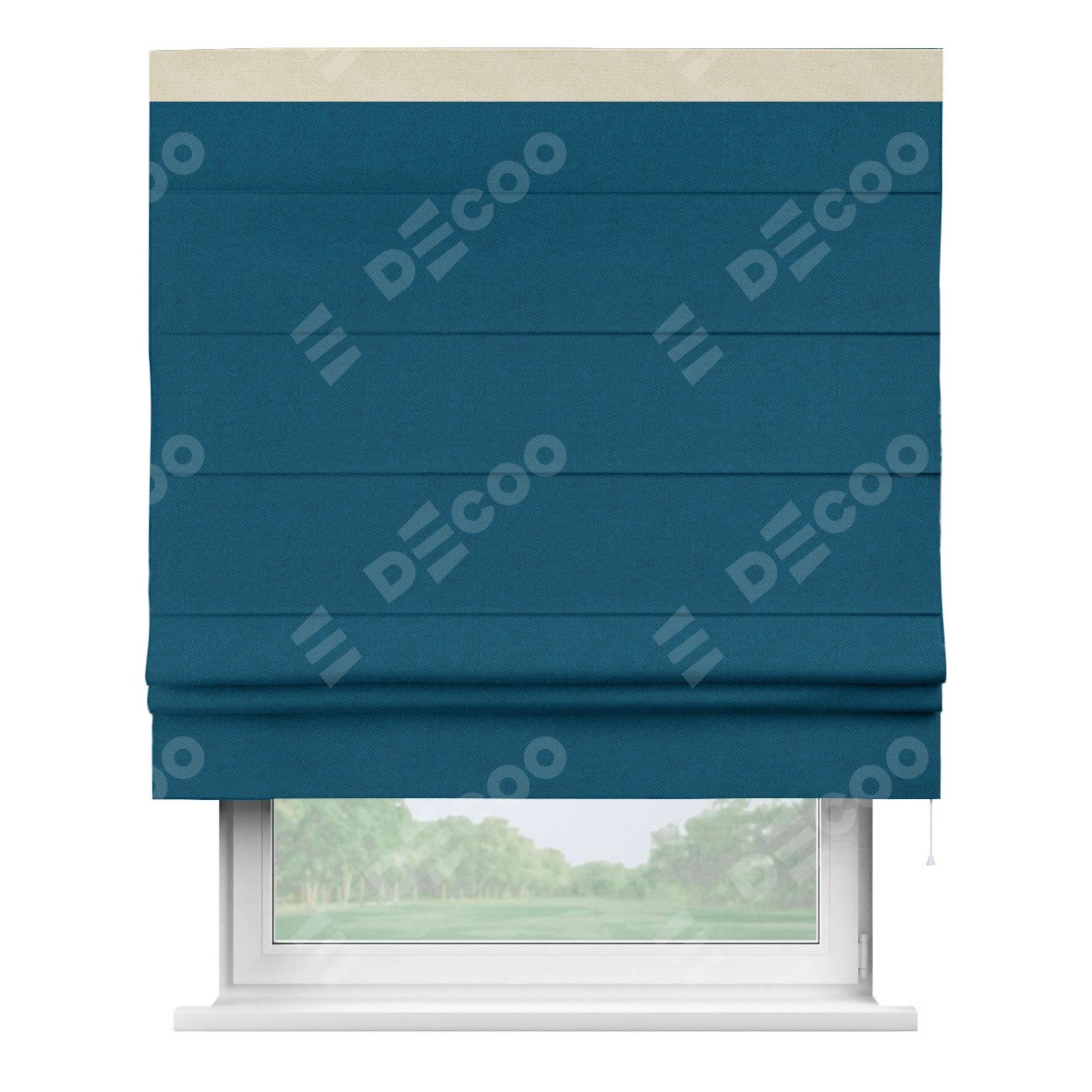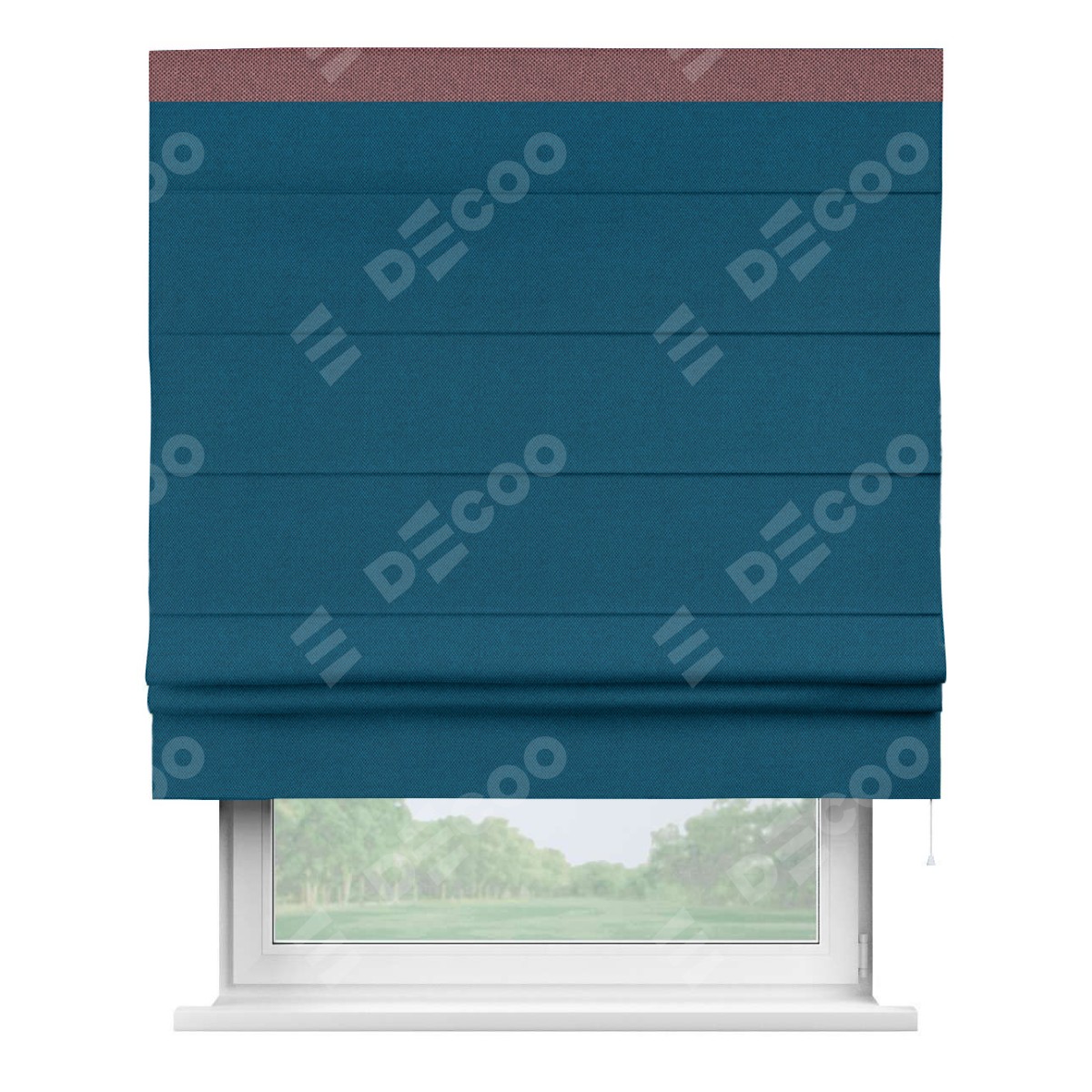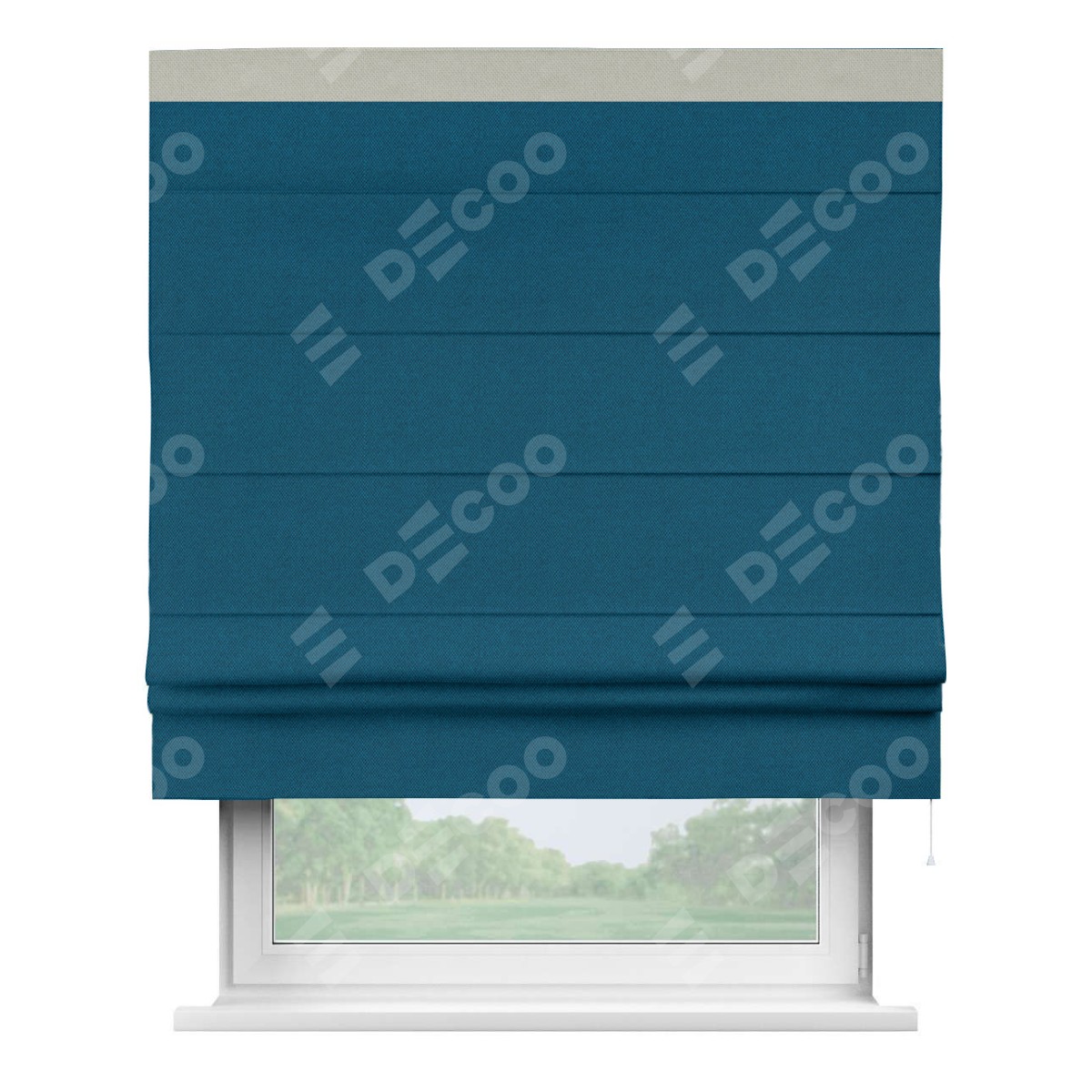 Римская штора производителя «Cortin», используется для проёма, пошита из ткани лён димаут синий, артикул 16260. Отделка шторы кантом «Кинг», ткань для канта используется из льна димаут разной расцветки на выбор. Имеет универсальный механизм и подходит для монтажа: на потолок, на стену и в нишу.