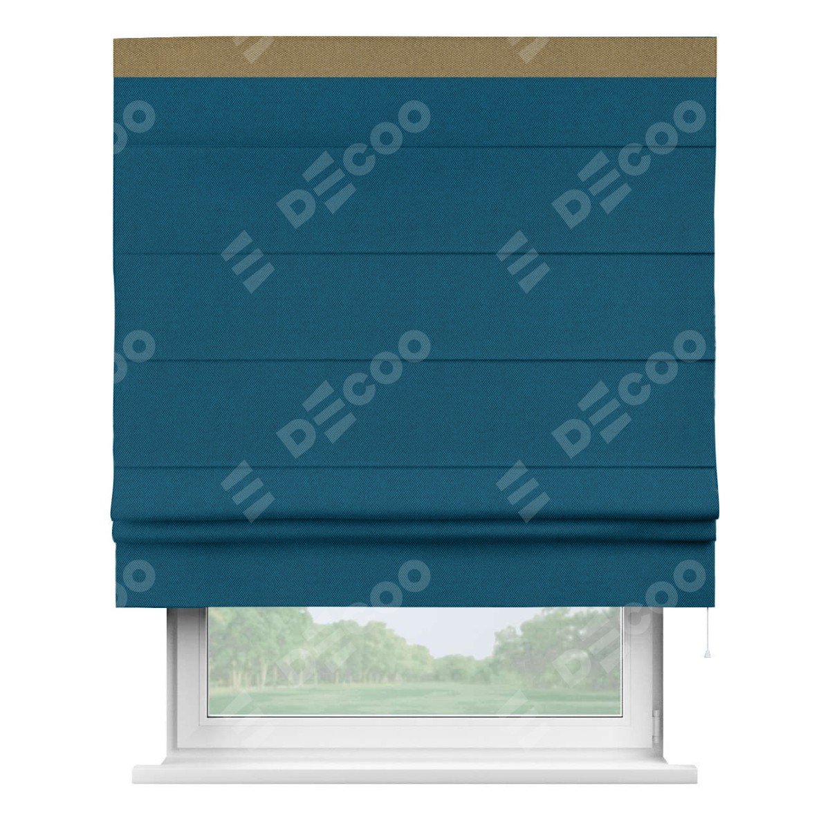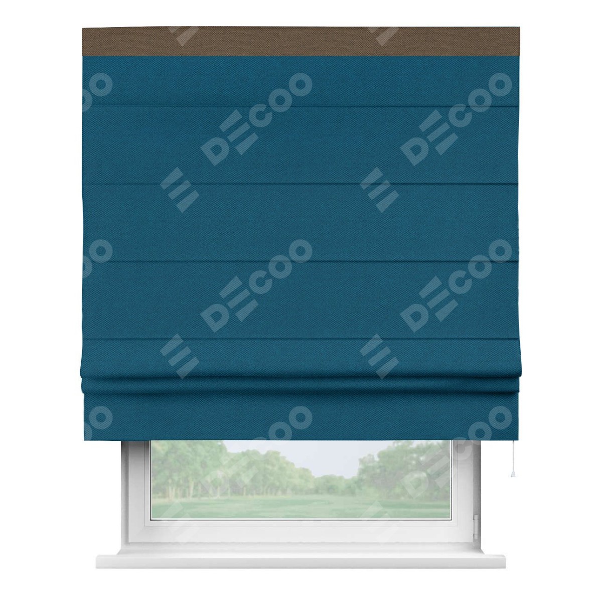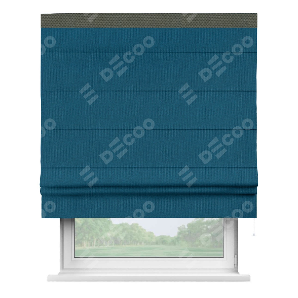 Римская штора производителя «Cortin», используется для проёма, пошита из ткани лён димаут синий, артикул 16260. Отделка шторы кантом «Кинг», ткань для канта используется из льна димаут разной расцветки на выбор. Имеет универсальный механизм и подходит для монтажа: на потолок, на стену и в нишу.