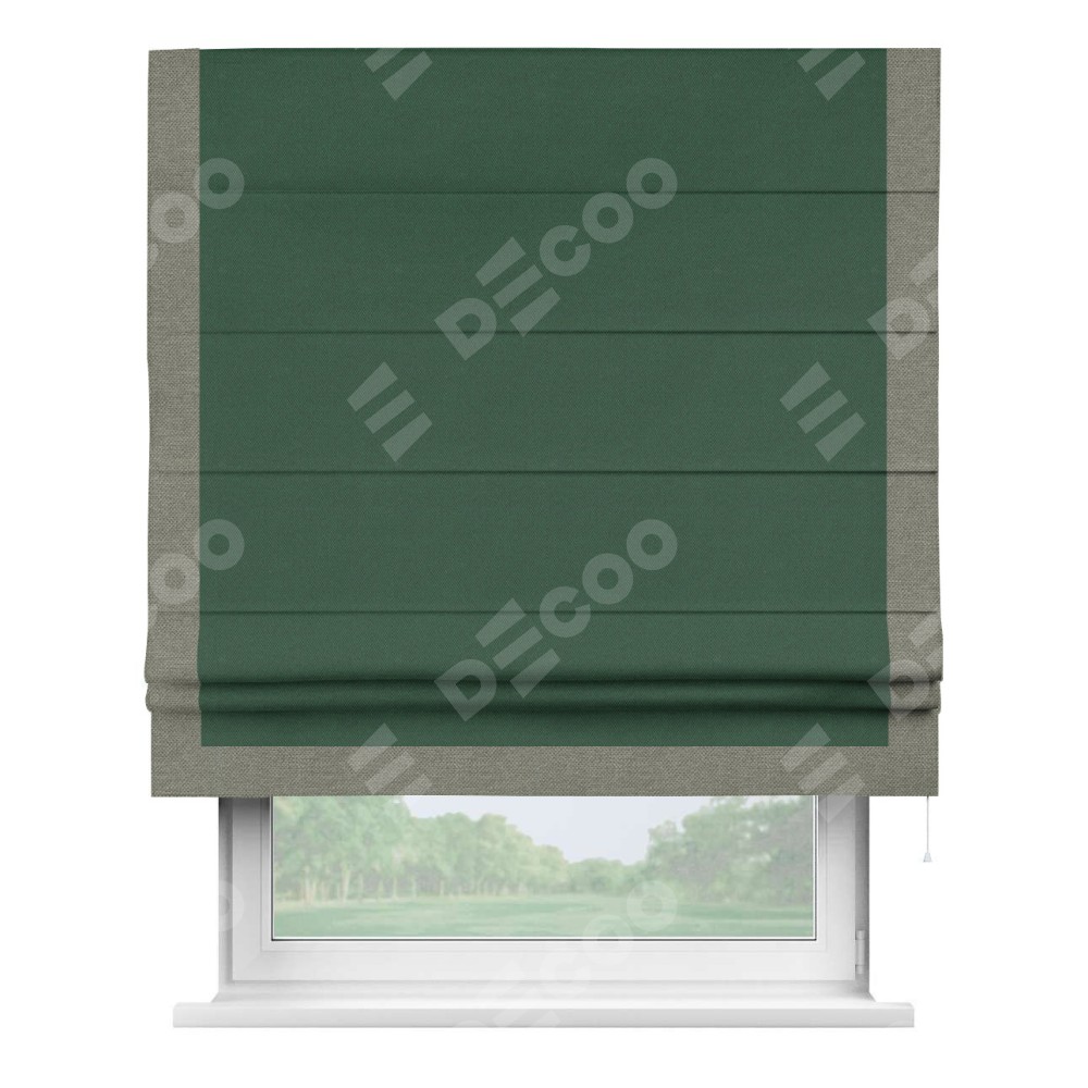 Римская штора производителя «Cortin», используется для проёма, пошита из ткани лён димаут тёмно-зелёный, артикул 16246. Отделка шторы кантом «Виктория», ткань для канта используется из льна димаут разной расцветки на выбор. Имеет универсальный механизм и подходит для монтажа: на потолок, на стену и в нишу.