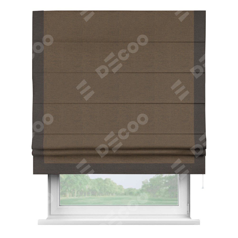 Римская штора производителя «Cortin», используется для проёма, пошита из ткани лён димаут тёмно-коричневый, артикул 83030. Отделка шторы кантом «Виктория», ткань для канта используется из льна димаут разной расцветки на выбор. Имеет универсальный механизм и подходит для монтажа: на потолок, на стену и в нишу.