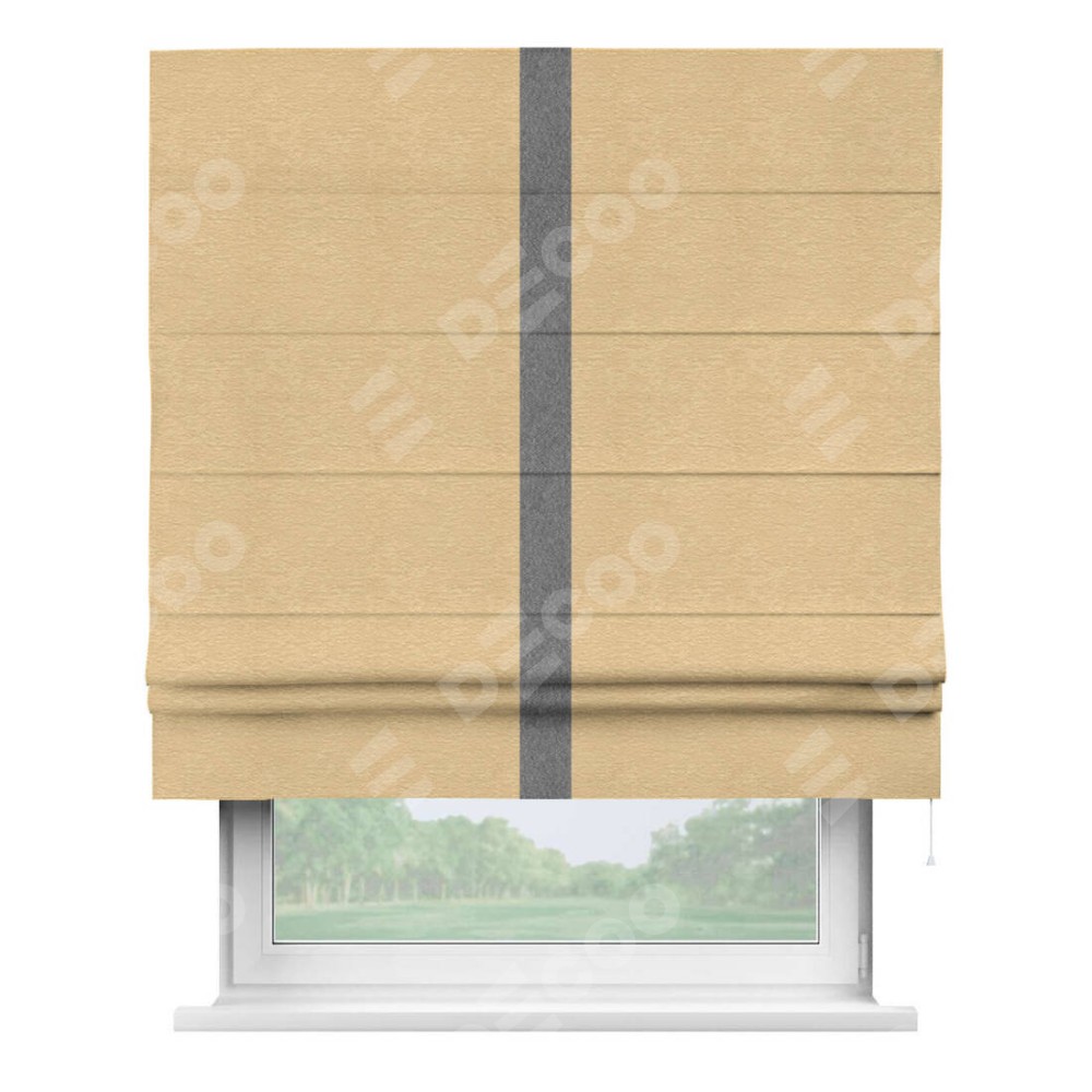 Римская штора производителя «Cortin», используется для проёма, пошита из ткани софт однотонный бежевый, артикул 4202 05. Отделка шторы кантом «Хайвэй», ткань для канта используется из софта разной расцветки на выбор. Имеет универсальный механизм и подходит для монтажа: на потолок, на стену и в нишу.