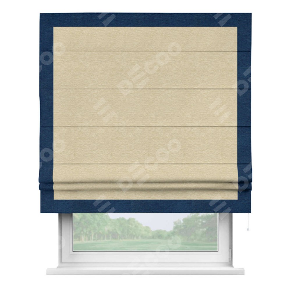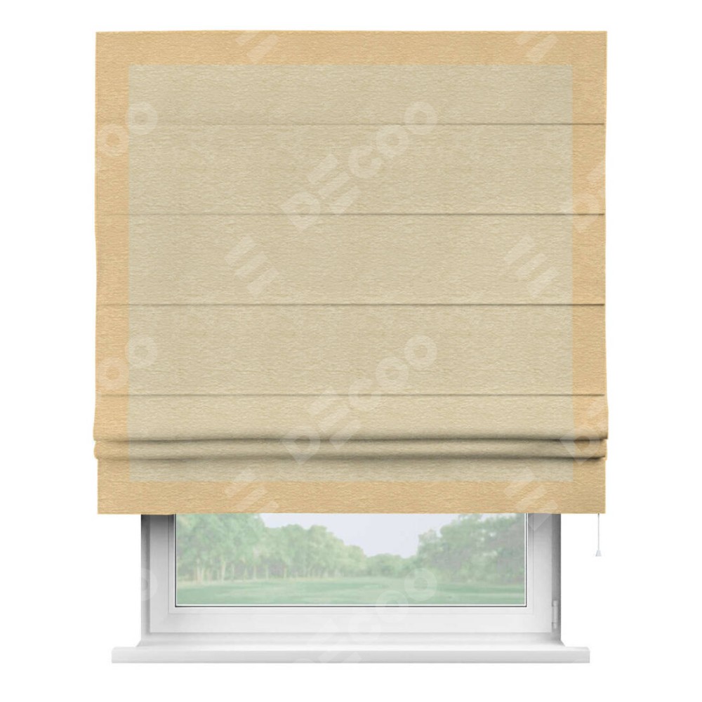 Римская штора производителя «Cortin», используется для проёма, пошита из ткани софт однотонный светло-бежевый, артикул 54426. Отделка шторы кантом «Чесс», ткань для канта используется из софта разной расцветки на выбор. Имеет универсальный механизм и подходит для монтажа: на потолок, на стену и в нишу.