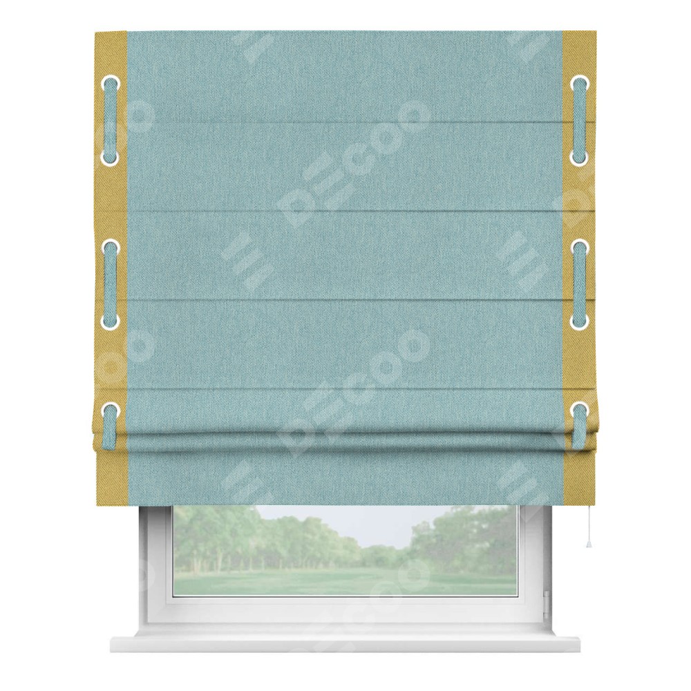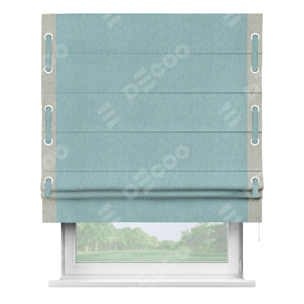 Римская штора производителя «Cortin», используется для проёма, пошита из ткани твид блэкаут небесно-голубой, артикул 21578. Отделка шторы кантом «Стрим Дуо» на кантах расположены люверсы с пояском, ткань для канта используется из твида разной расцветки на выбор. Ткань для пояска обычно используется из основной ткани шторы, а так же можно сделать из любой расцветки по желанию. Имеет универсальный механизм и подходит для монтажа: на потолок, на стену и в нишу.